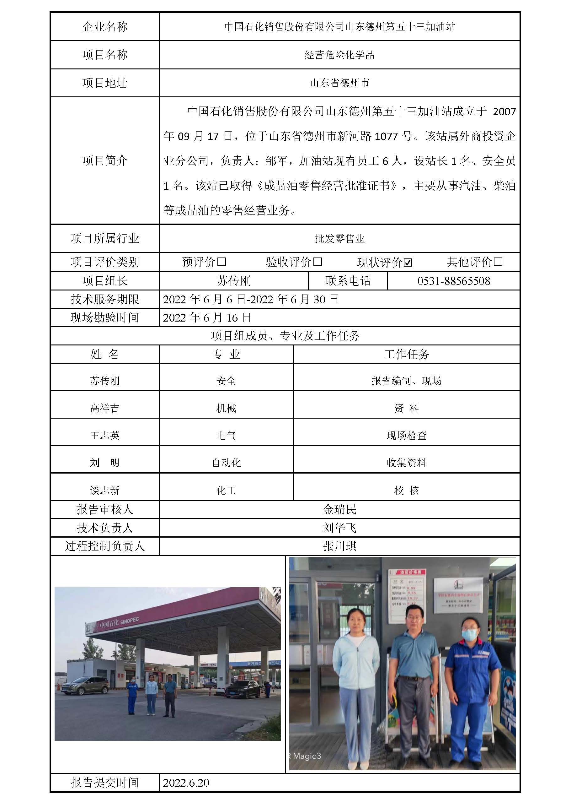 中国石化销售股份有限公司山东德州第五十三加油站安全评价报告信息公开