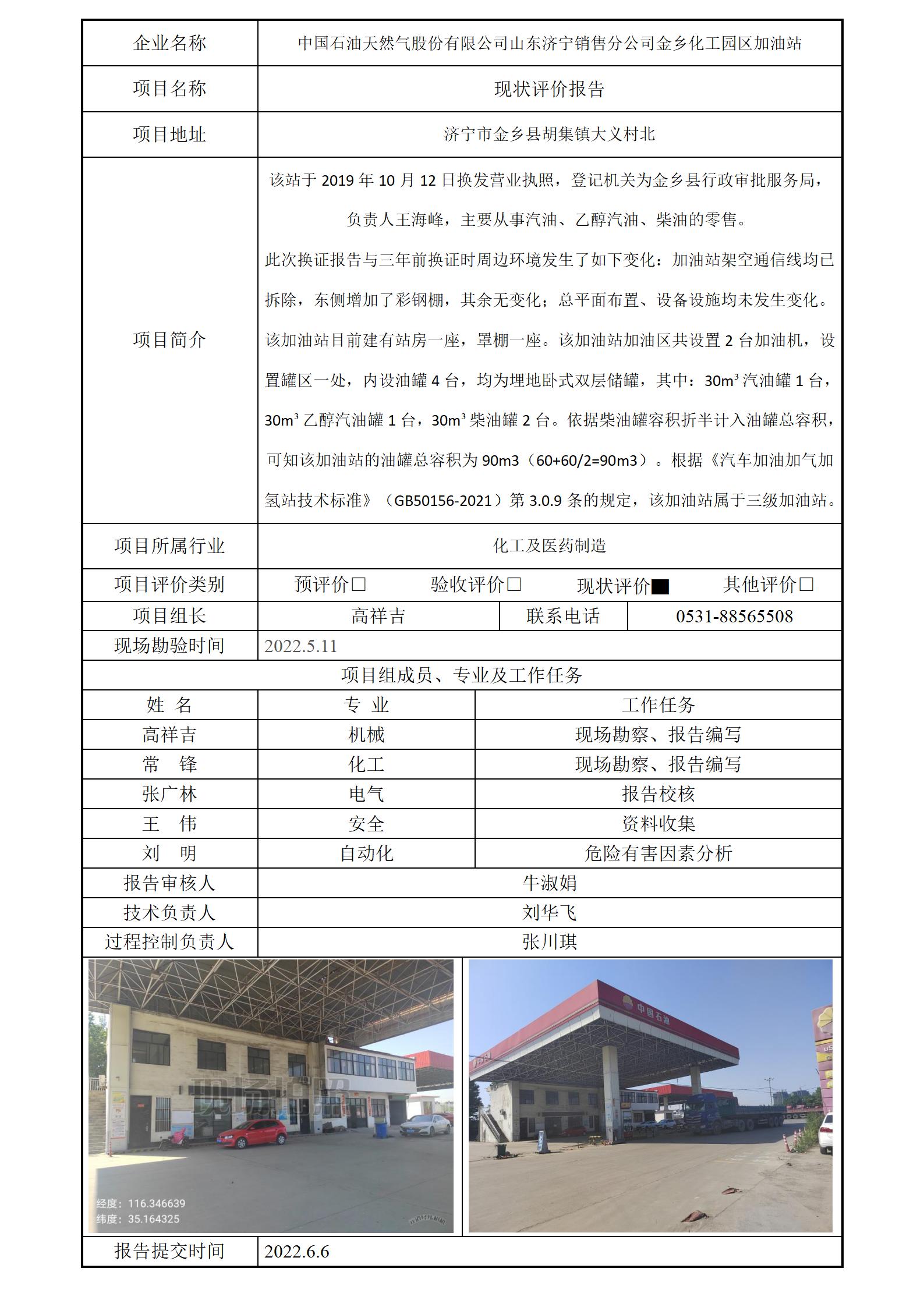 中国石油天然气股份有限公司山东济宁销售分公司金乡化工园区加油站安全评价报告信息公开