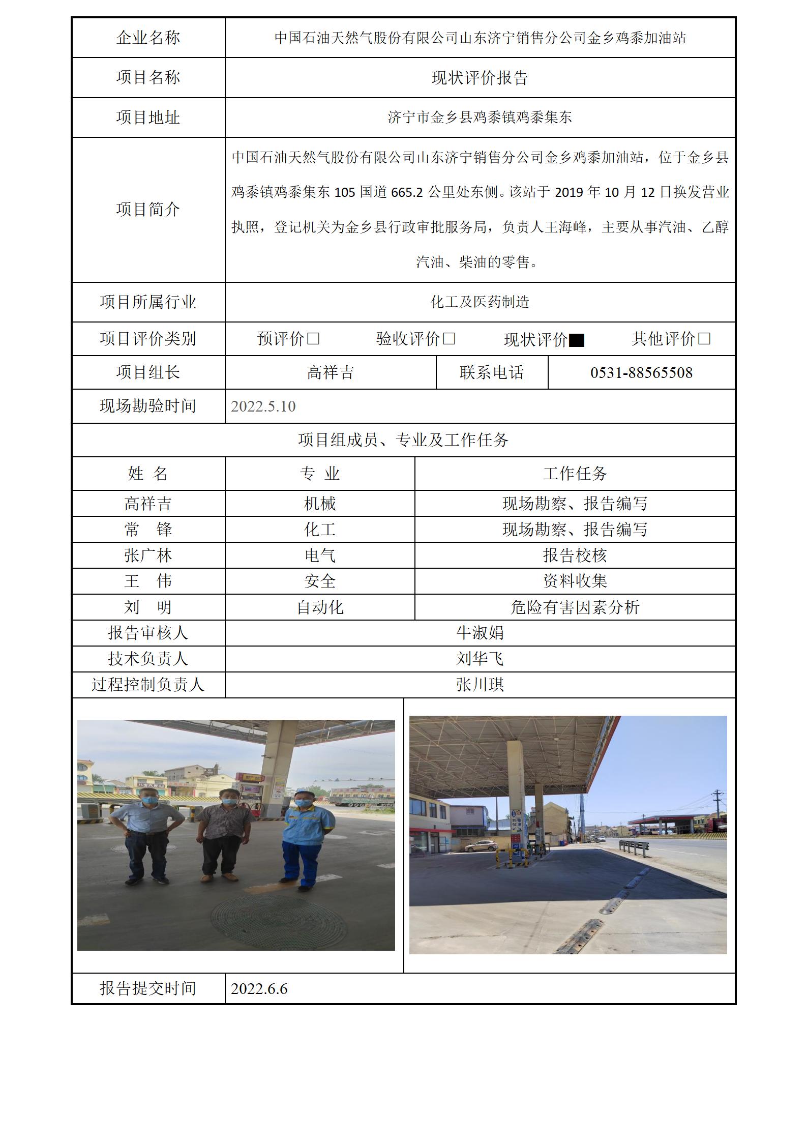 中国石油天然气股份有限公司山东济宁销售分公司金乡鸡黍加油站安全评价报告信息公开