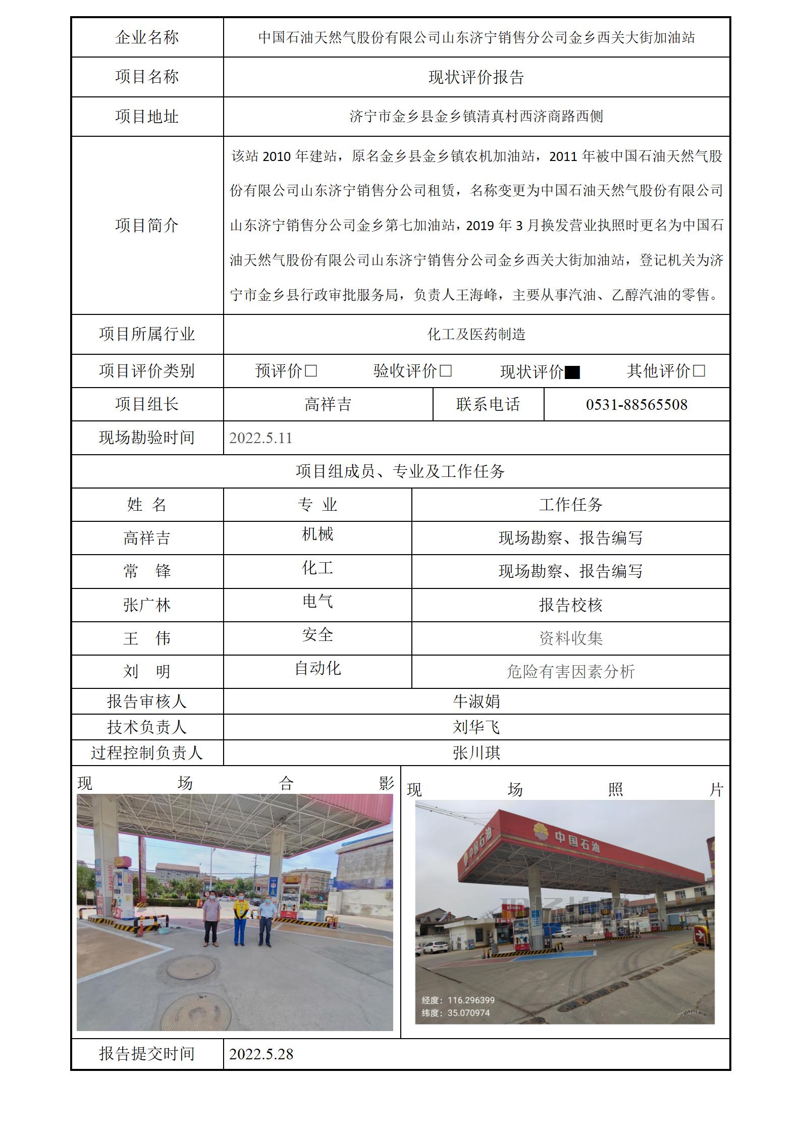 中国石油天然气股份有限公司山东济宁销售分公司金乡西关大街加油站安全评价报告信息公开