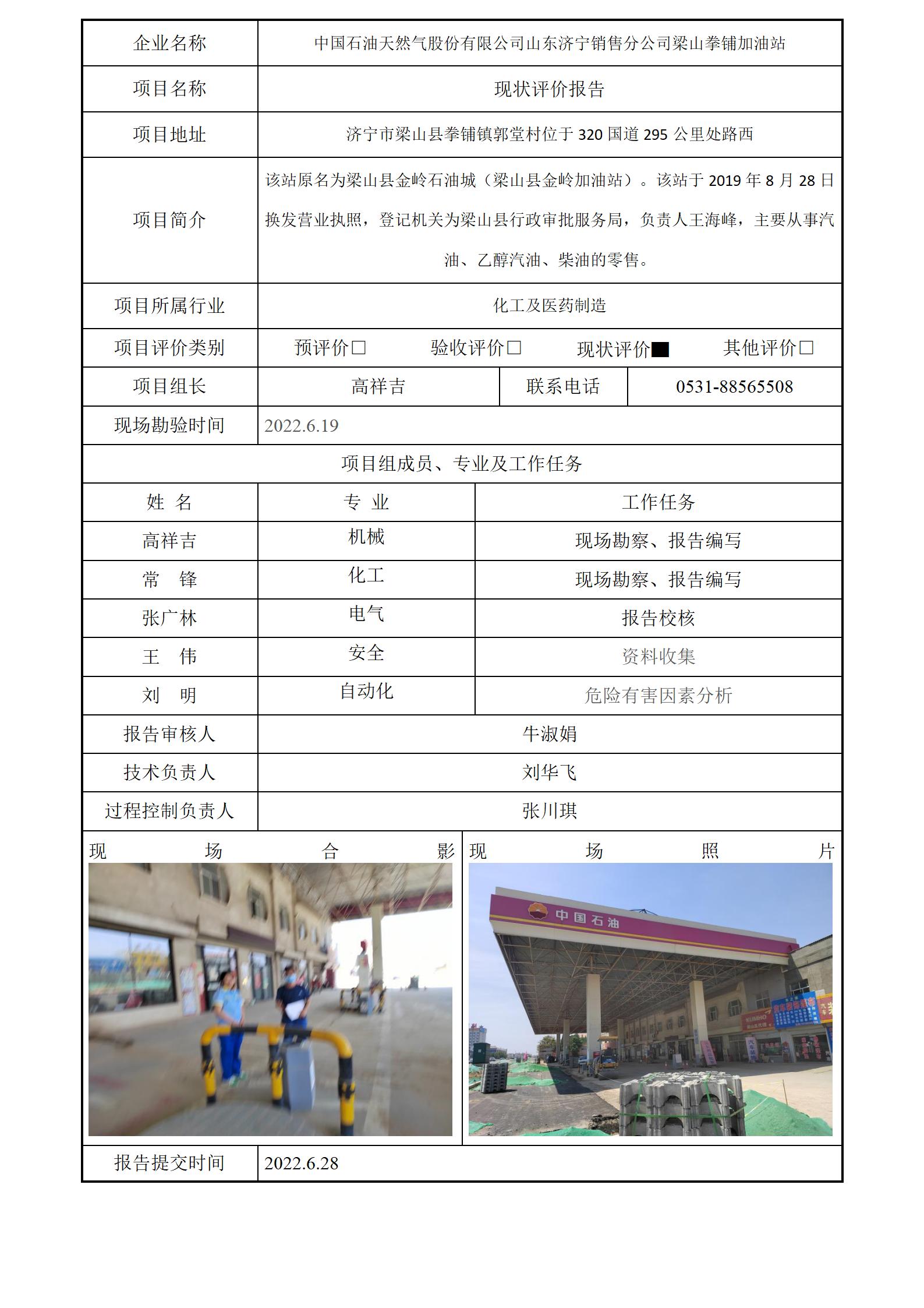中国石油天然气股份有限公司山东济宁销售分公司梁山拳铺加油站安全评价报告信息公开