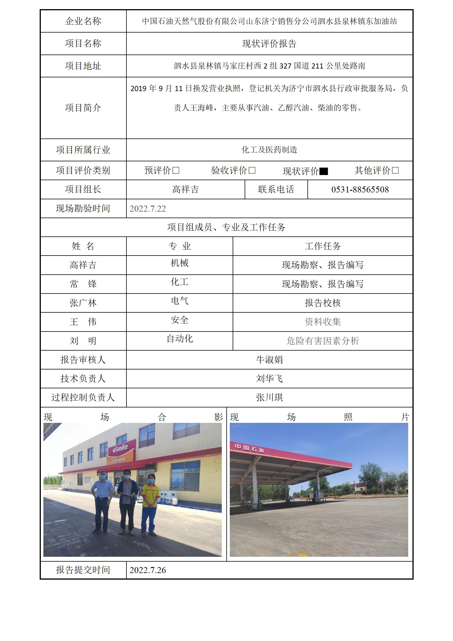 中国石油天然气股份有限公司山东济宁销售分公司泗水县泉林镇东加油站安全评价报告信息公开