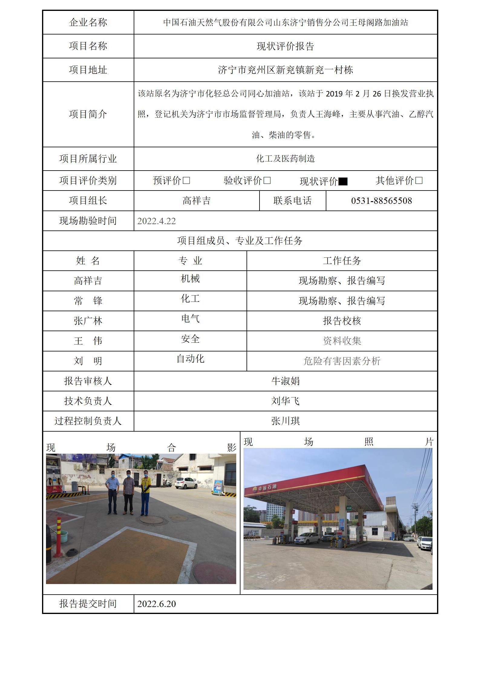 中国石油天然气股份有限公司山东济宁销售分公司王母阁路加油站安全评价报告信息公开