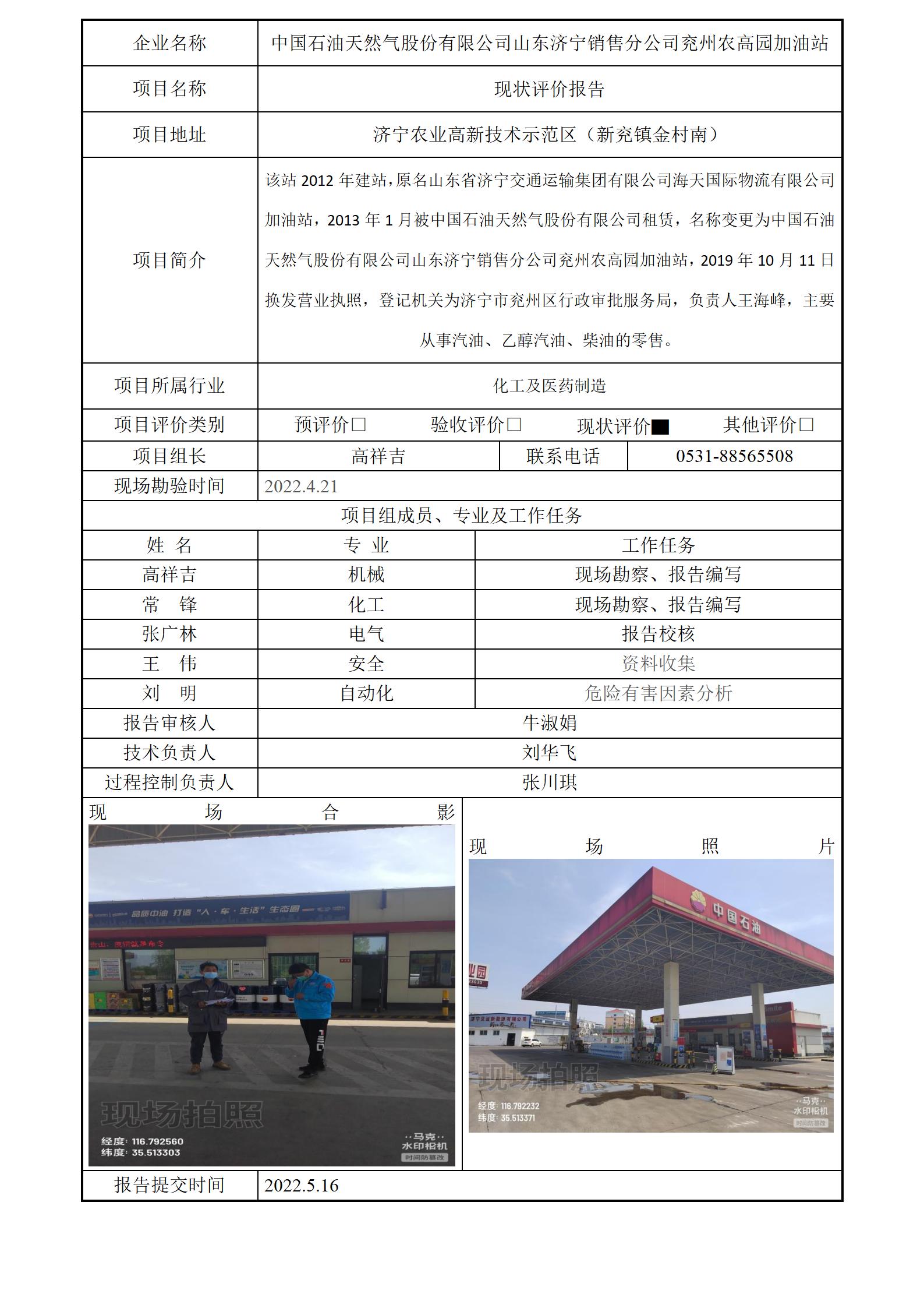 中国石油天然气股份有限公司山东济宁销售分公司兖州农高园加油站安全评价报告信息公开