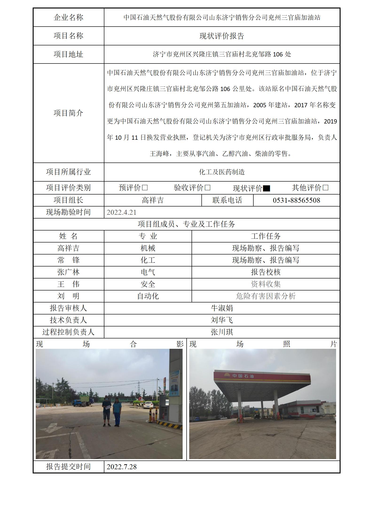 中国石油天然气股份有限公司山东济宁销售分公司兖州三官庙加油站安全评价报告信息公开