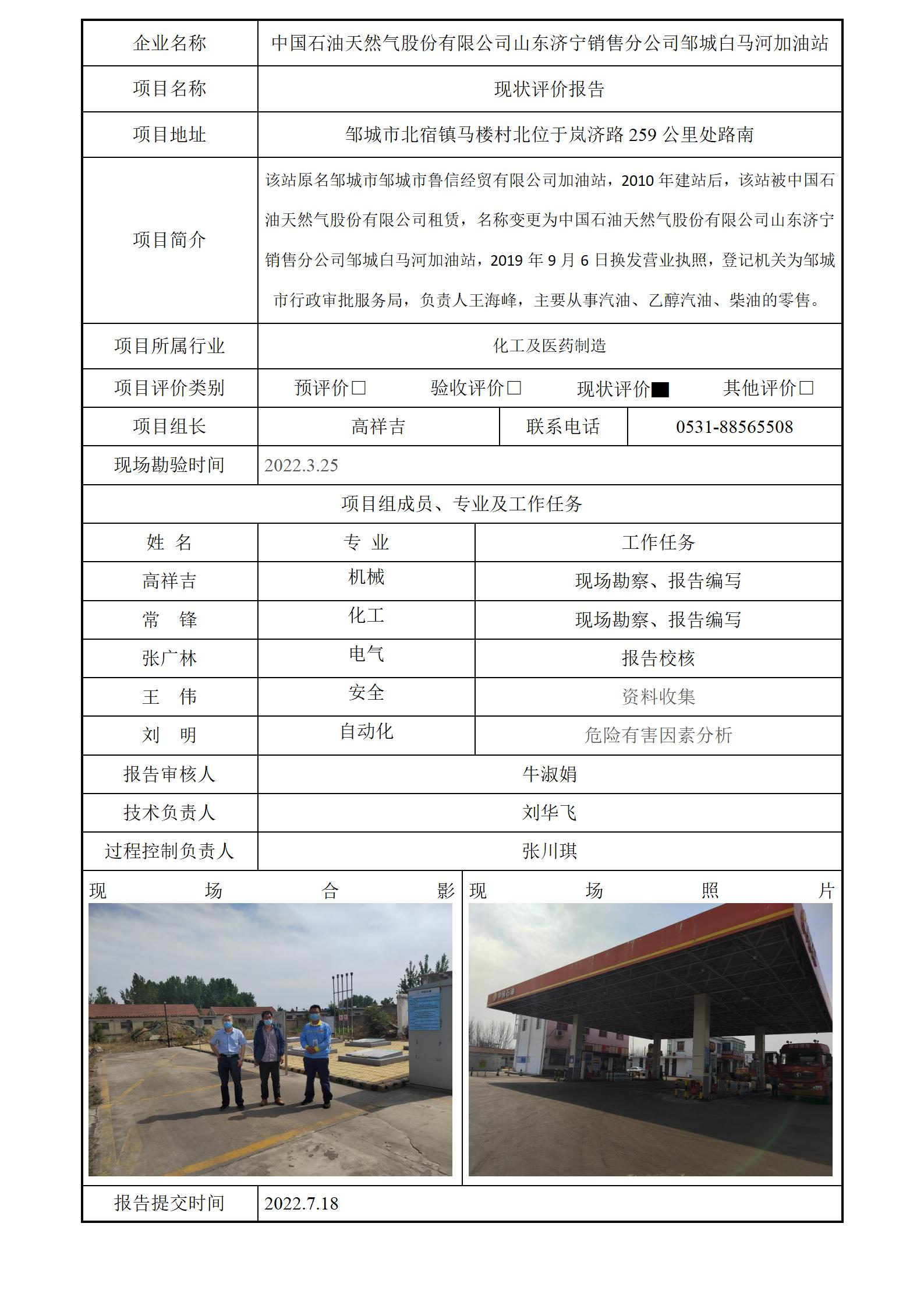 中国石油天然气股份有限公司山东济宁销售分公司邹城白马河加油站安全评价报告信息公开