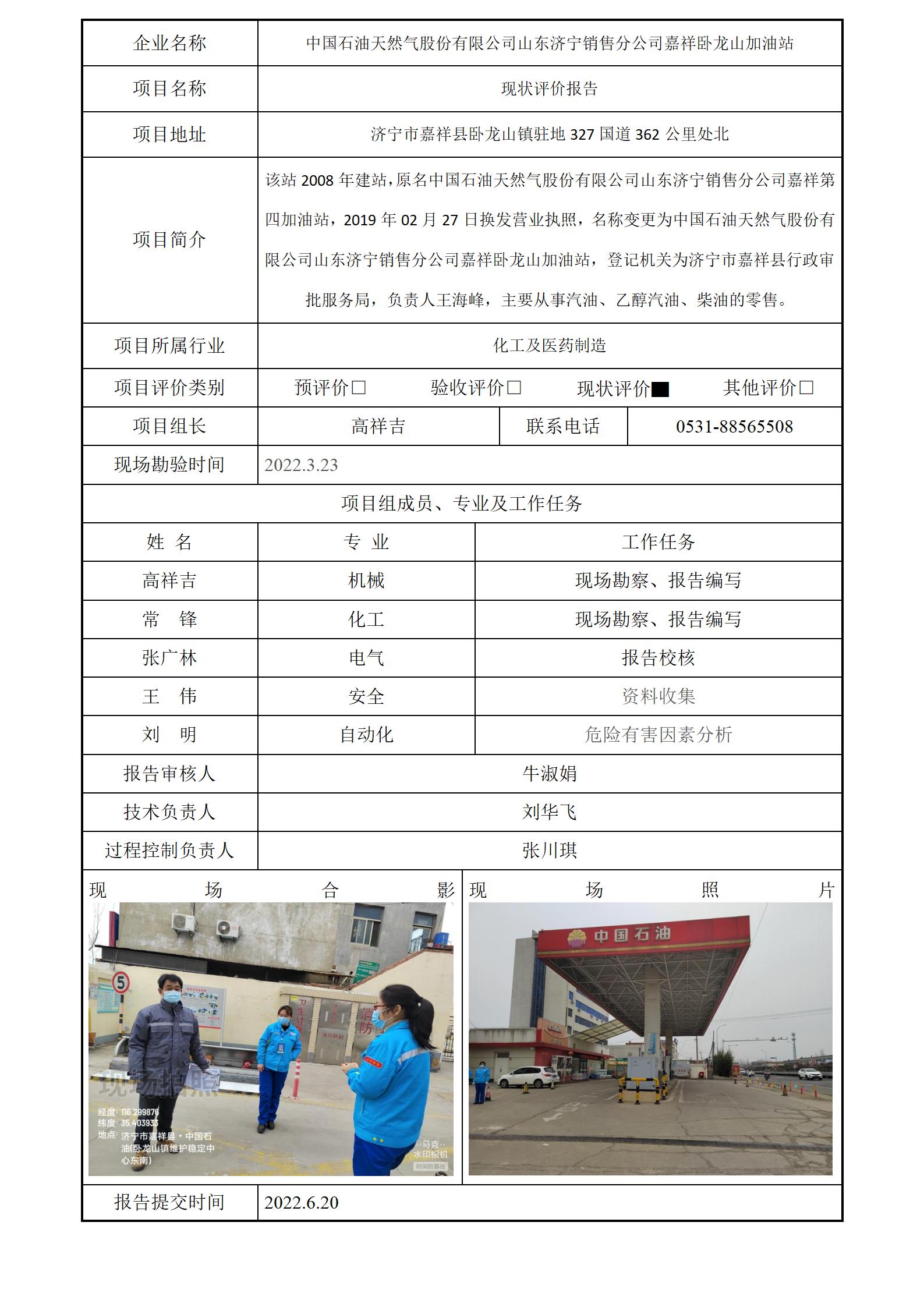 中国石油天然气股份有限公司山东济宁销售分公司卧龙山加油站安全评价报告信息公开