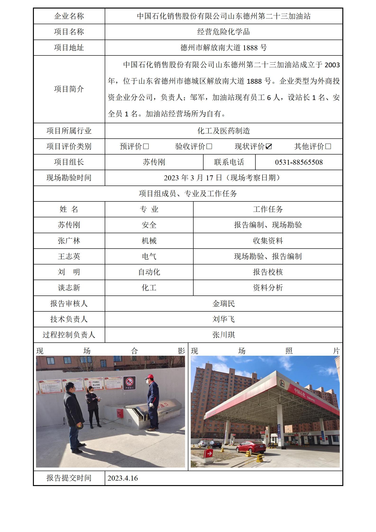 中国石化销售股份有限公司山东德州第二十三加油站安全评价报告信息公开