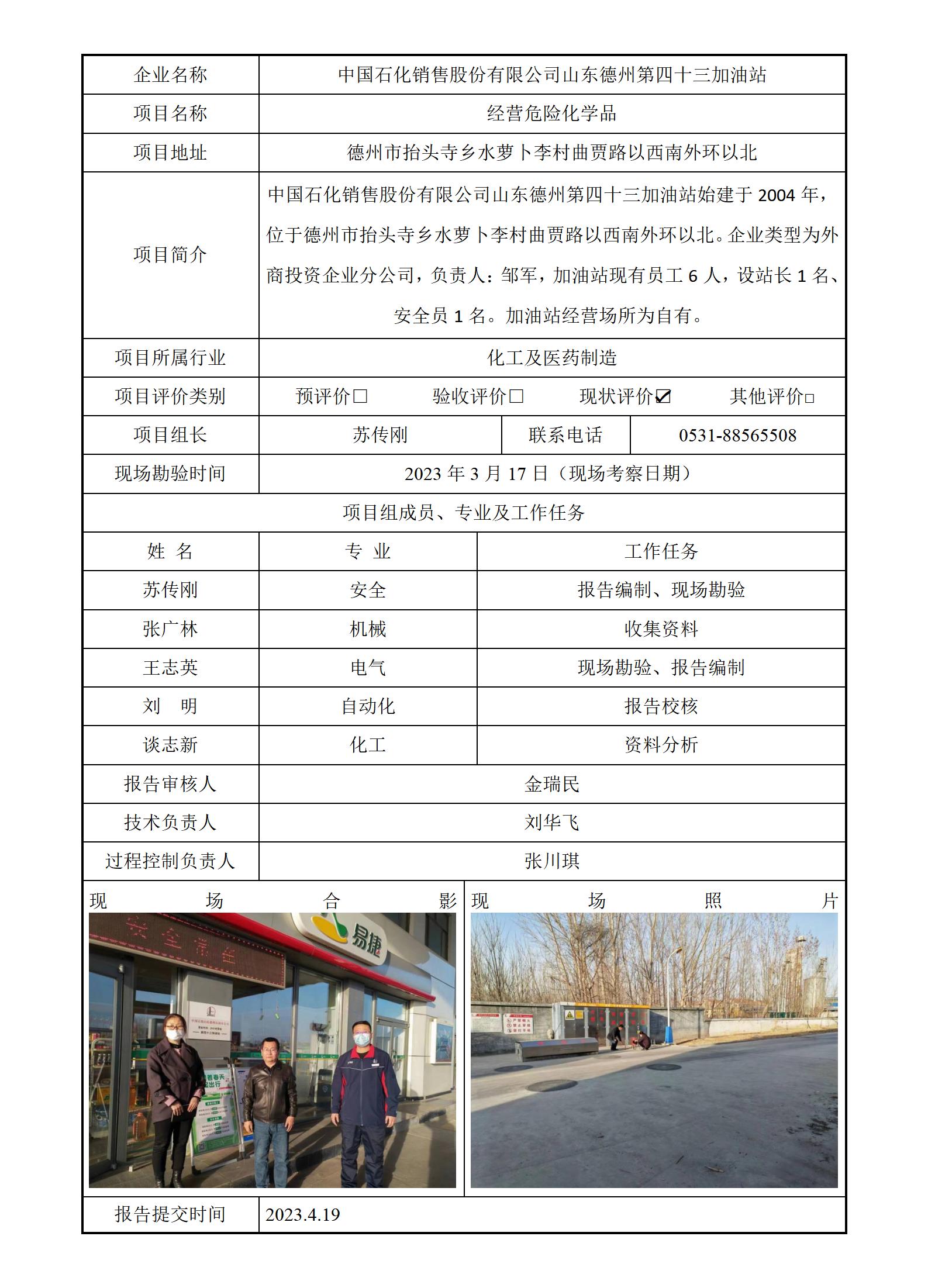 中国石化销售股份有限公司山东德州第四十三加油站安全评价报告信息公开