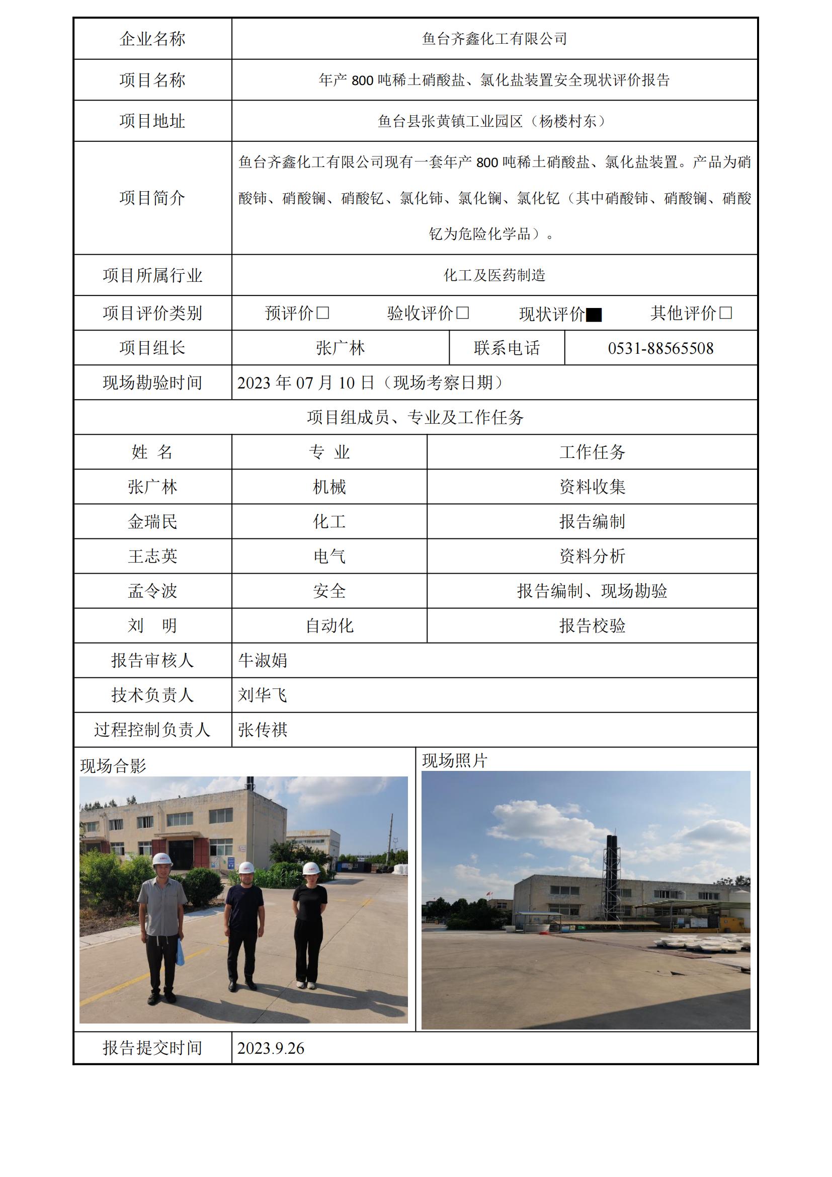 鱼台齐鑫化工有限公司年产 800 吨稀土硝酸盐、氯化盐装置安全现状评价报告网上公示