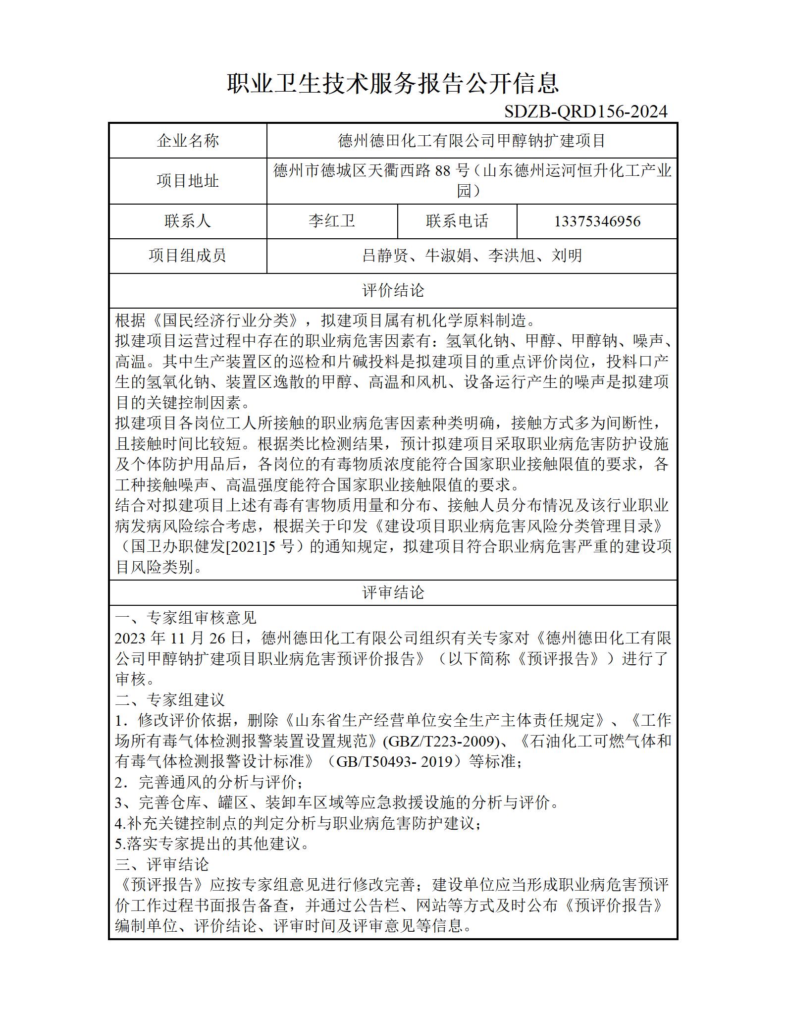 ZBZY23-YP-008德州德田化工有限公司甲醇钠扩建项目职业病危害预评价公开信息