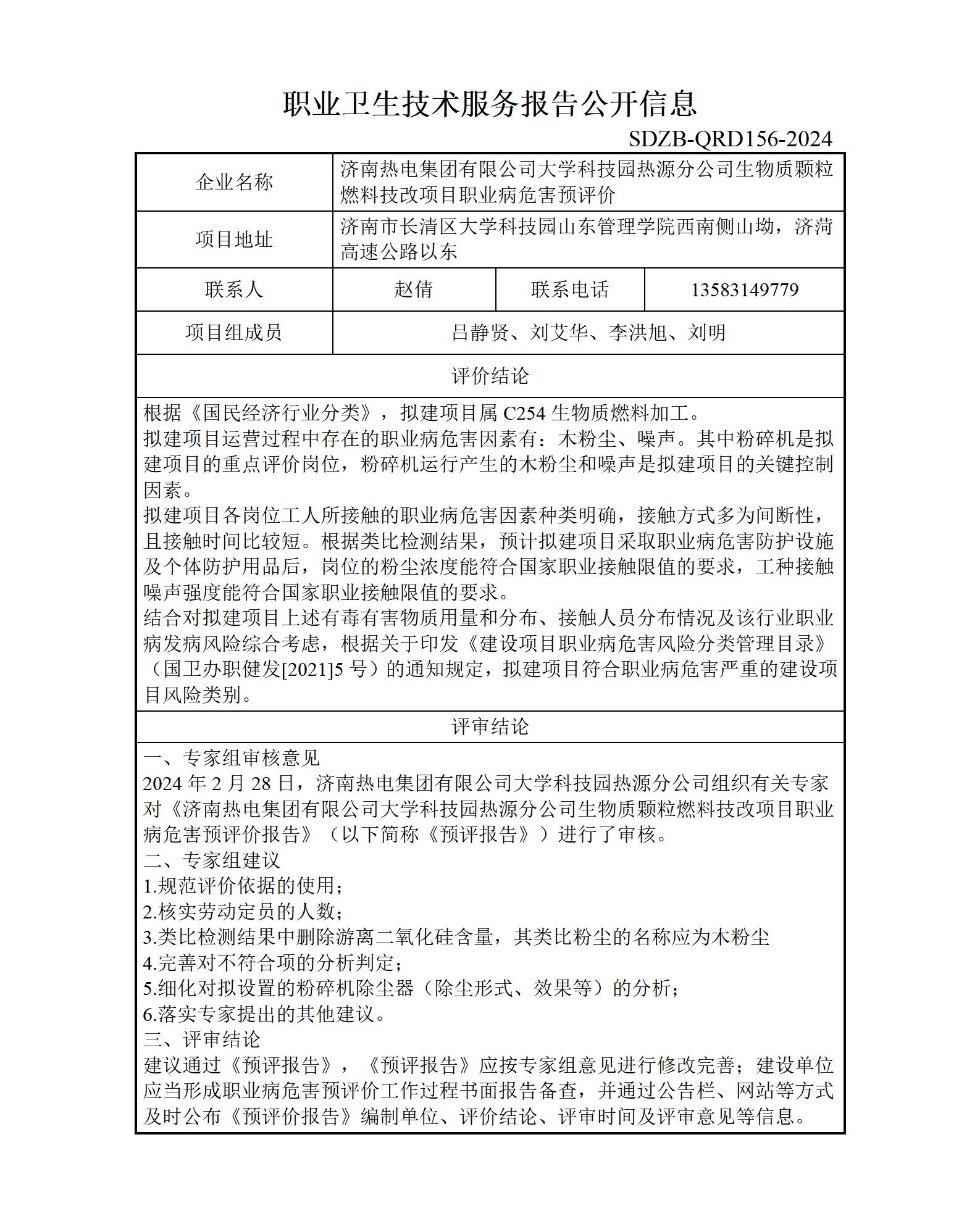 ZBZY24-YP-001济南热电集团有限公司大学科技园热源分公司生物质颗粒燃料技改项目职业病危害预评价公开信息