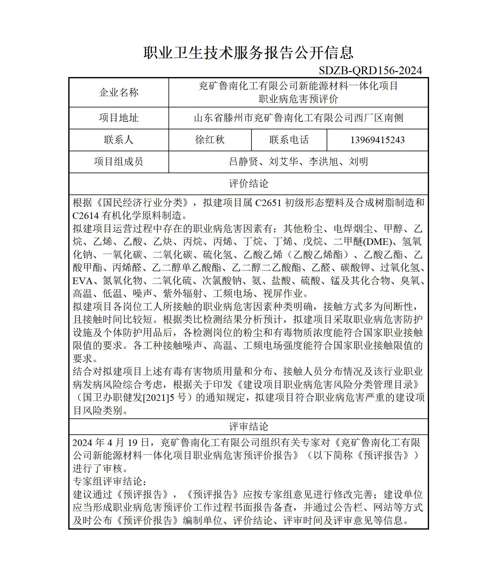 ZBZY24-YP-004兖矿鲁南化工有限公司新能源材料一体化项目职业病危害预评价公开信息
