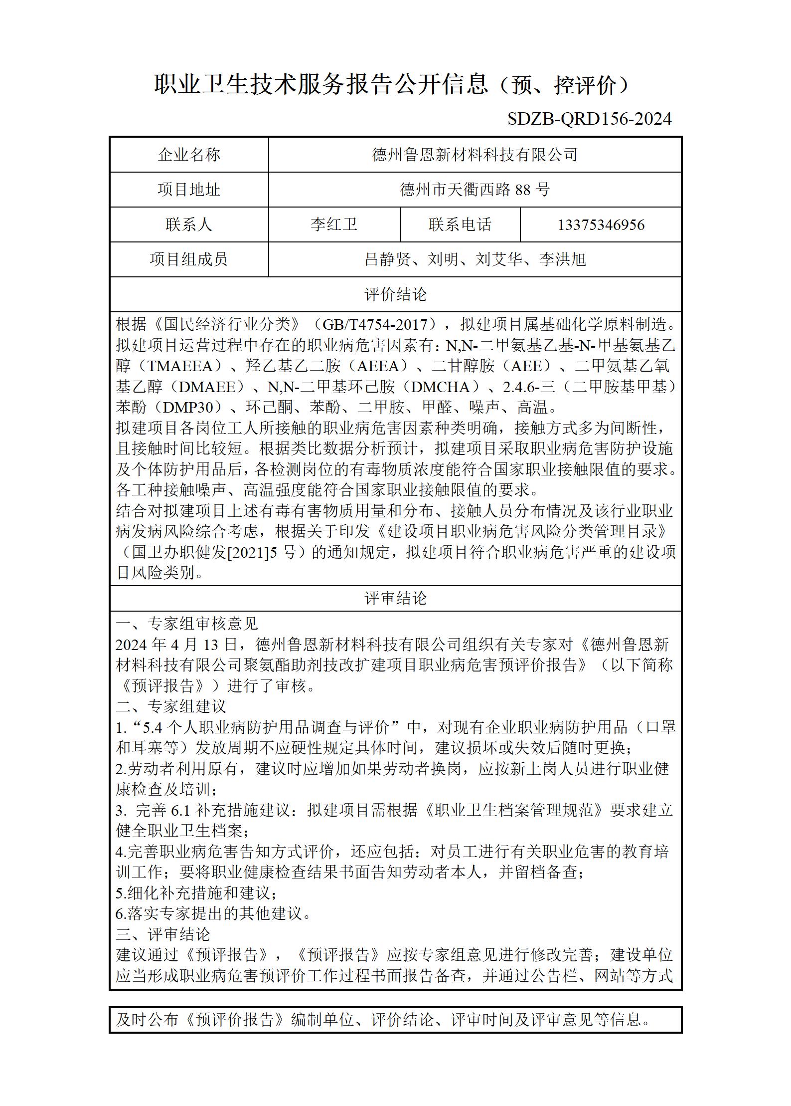 ZBZY24-YP-003德州鲁恩新材料科技有限公司聚氨酯助剂技改扩建项目职业卫生技术服务报告公开信息