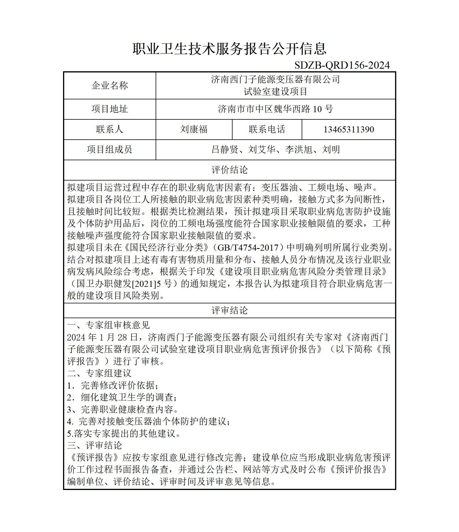 ZBZY24-YP-002济南西门子能源变压器有限公司试验室建设项目职业病危害预评价公开信息