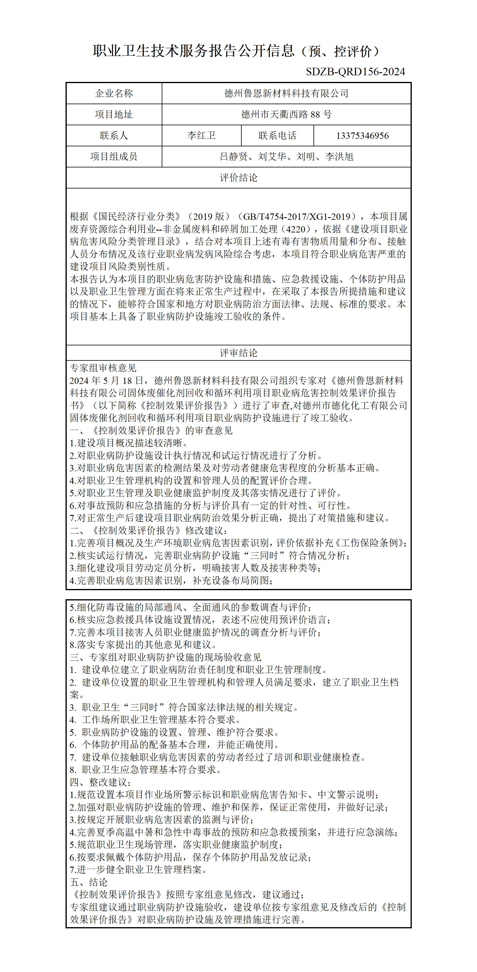 ZBZY24-KP-002德州鲁恩新材料科技有限公司固体废催化剂回收和循环利用项目职业卫生技术服务报告公开信息