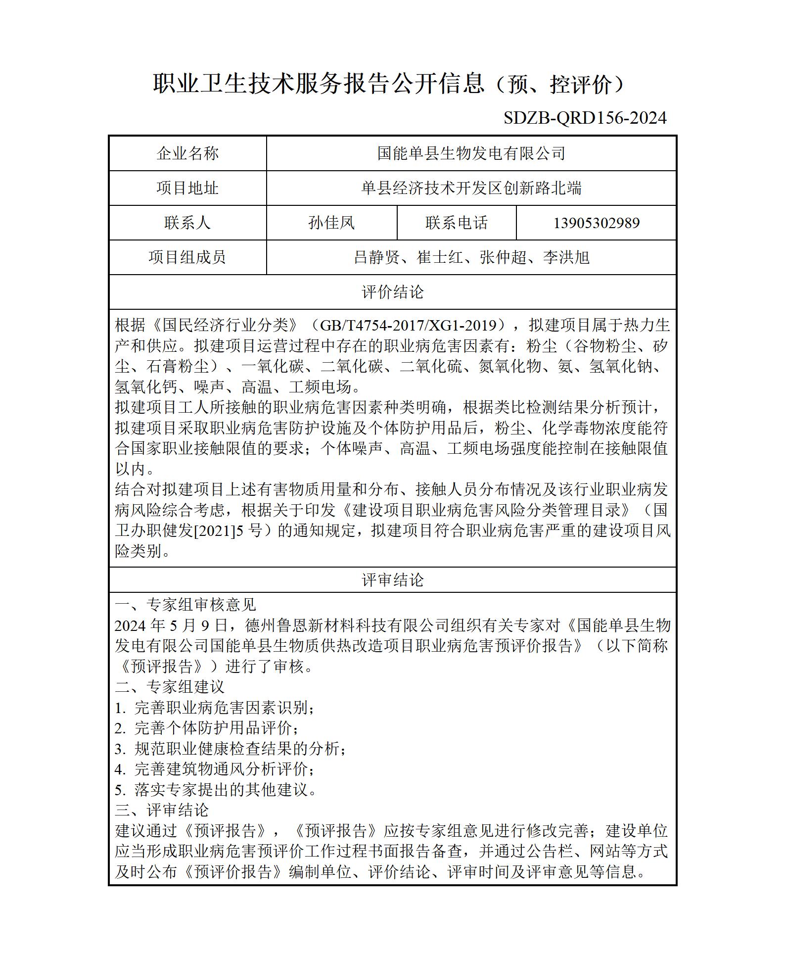 ZBZY24-YP-005国能单县生物发电有限公司国能单县生物质供热改造项目职业卫生技术服务报告公开信息