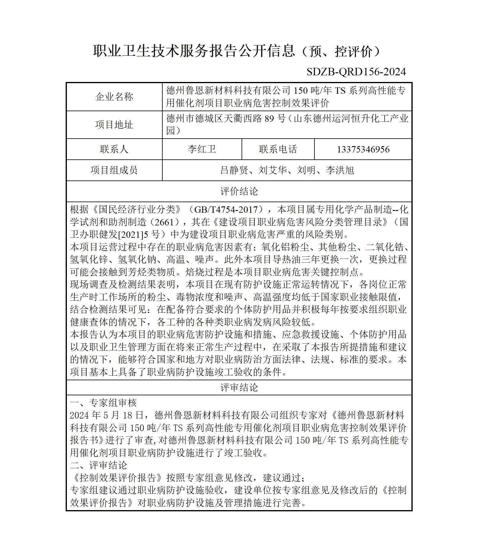 ZBZY24-KP-003德州鲁恩新材料科技有限公司150吨年TS系列高性能专用催化剂项目职业病危害控制效果评价--职业卫生技术服务报告公开信息