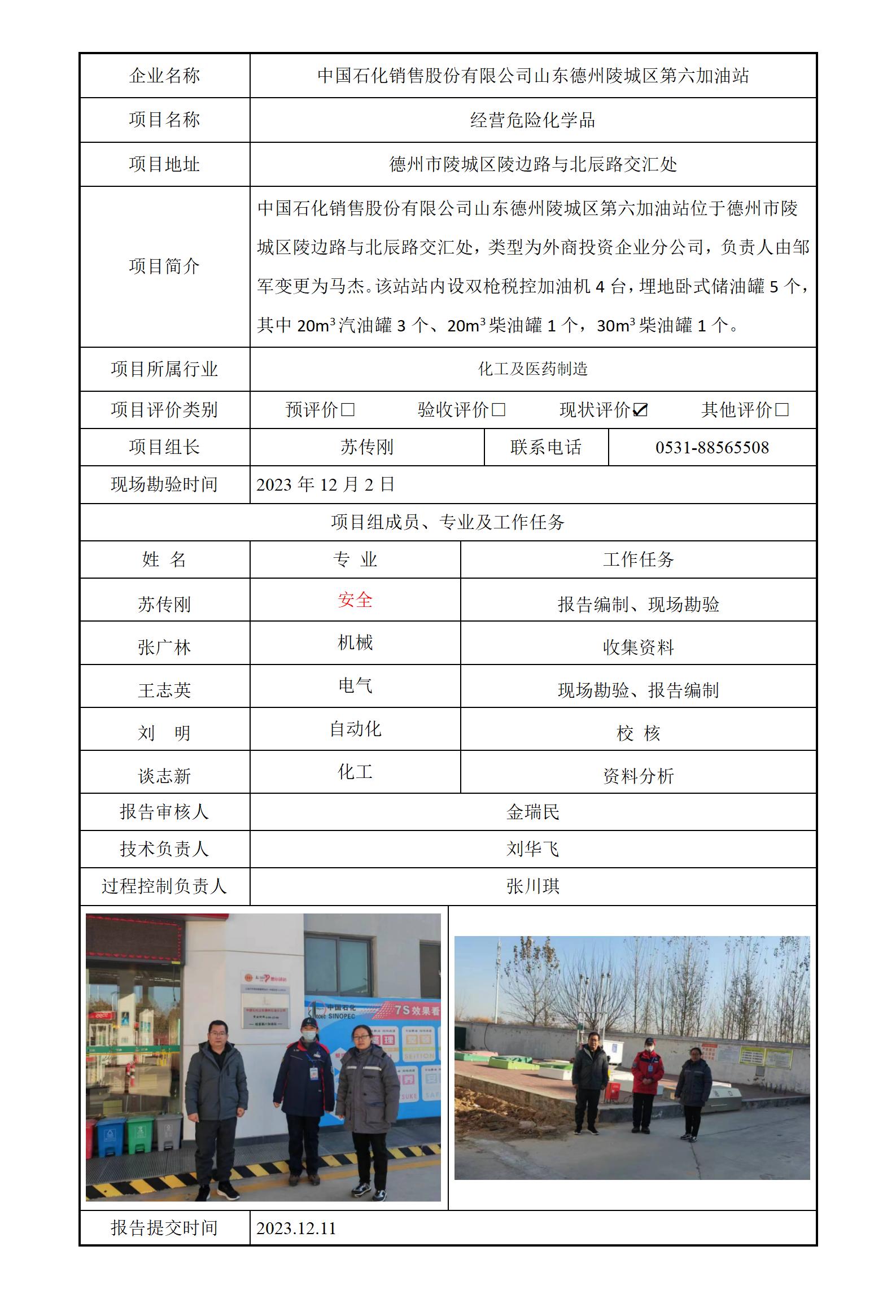 中国石化销售股份有限公司山东德州陵城区第六加油站安全评价报告信息公开