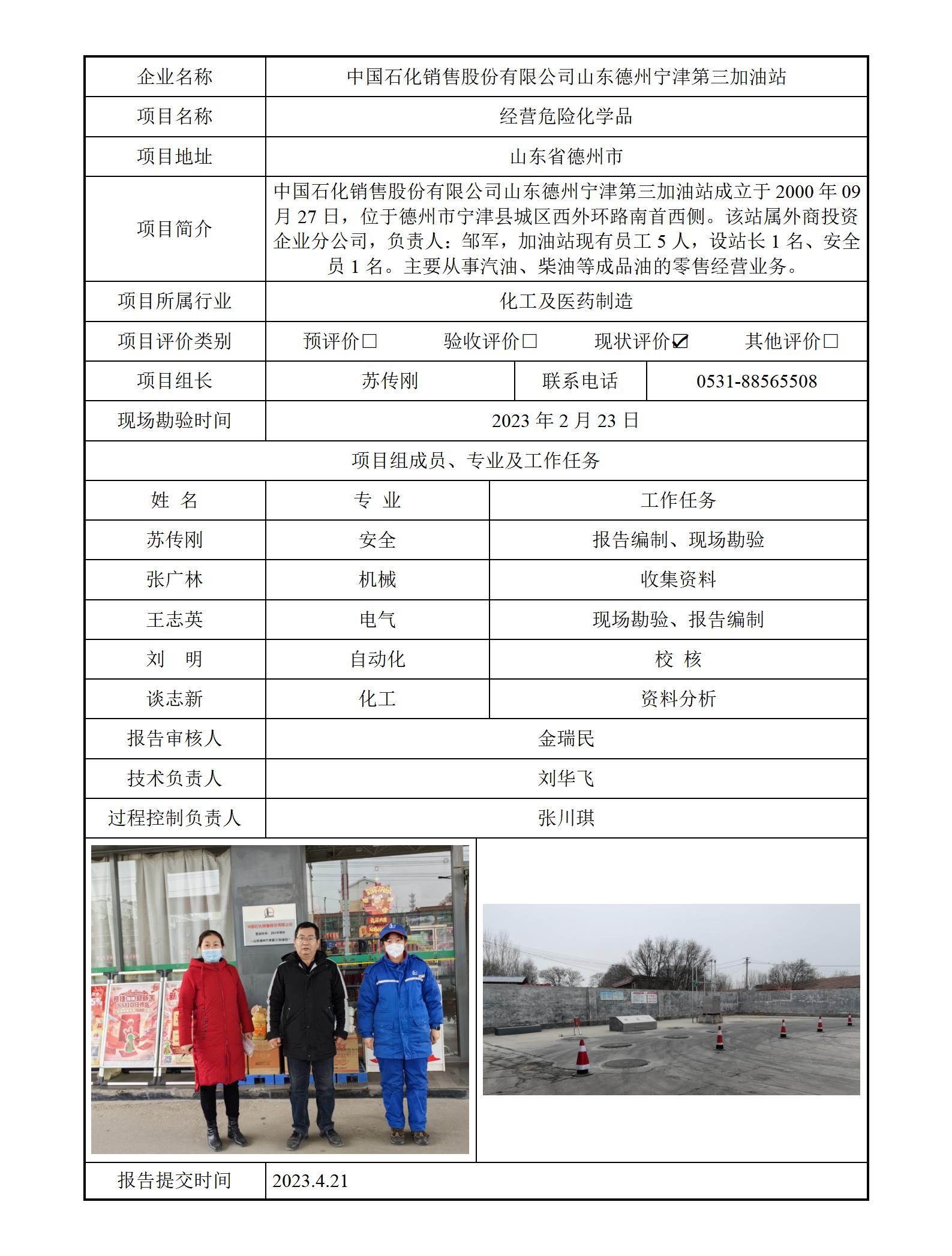 中国石化销售股份有限公司山东德州宁津第三加油站安全评价报告信息公开