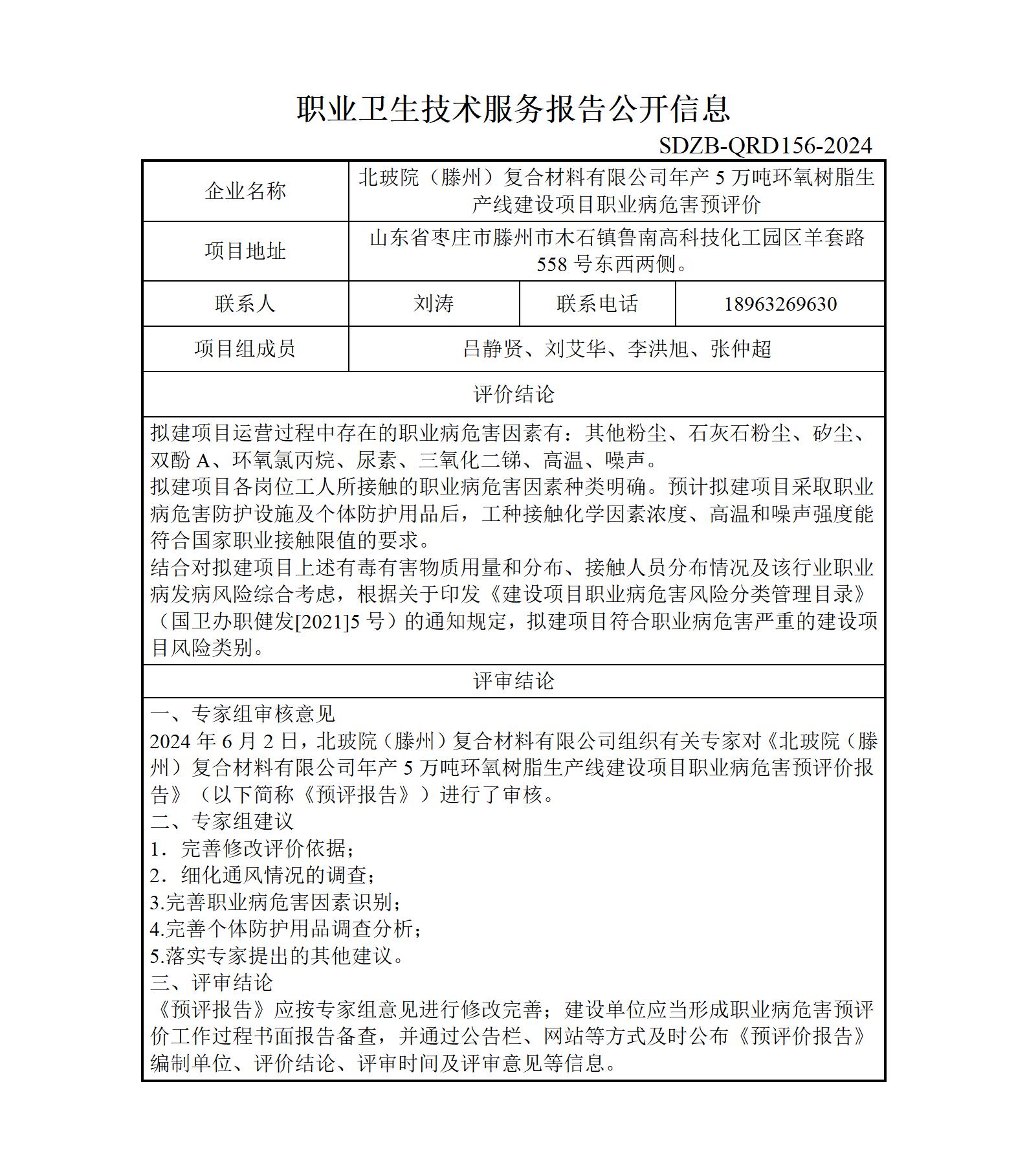 ZBZY24-YP-007北玻院(滕州)复合材料有限公司年产5万吨环氧树脂职业病危害预评价 信息公开
