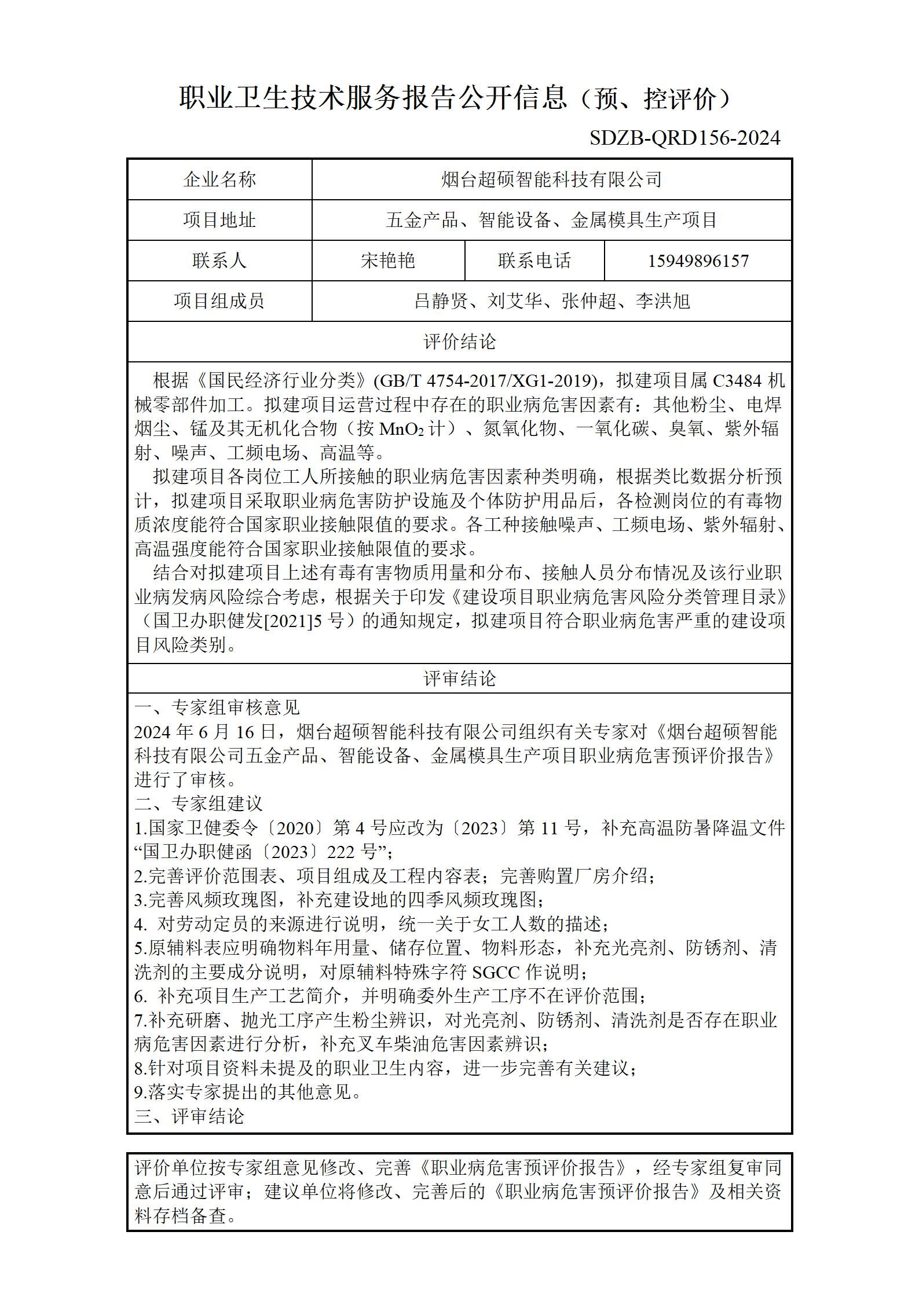 ZBZY24-YP-010烟台超硕智能科技有限公司五金产品、智能设备、金属模具生产项目职业卫生技术服务报告公开信息