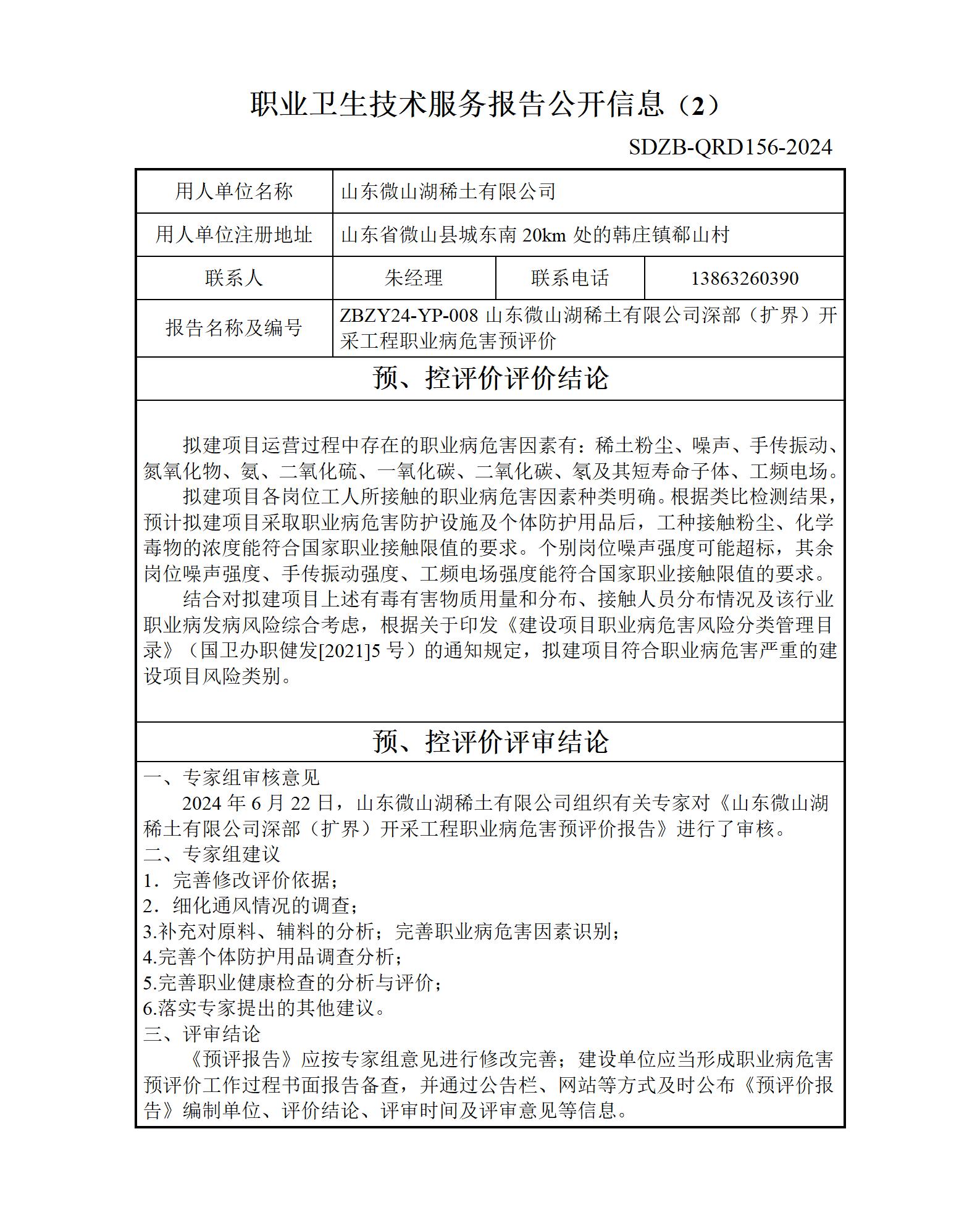 ZBZY24-YP-008山东微山湖稀土有限公司深部(扩界)开采工程职业病危害预评价---职业卫生技术服务报告公开信息