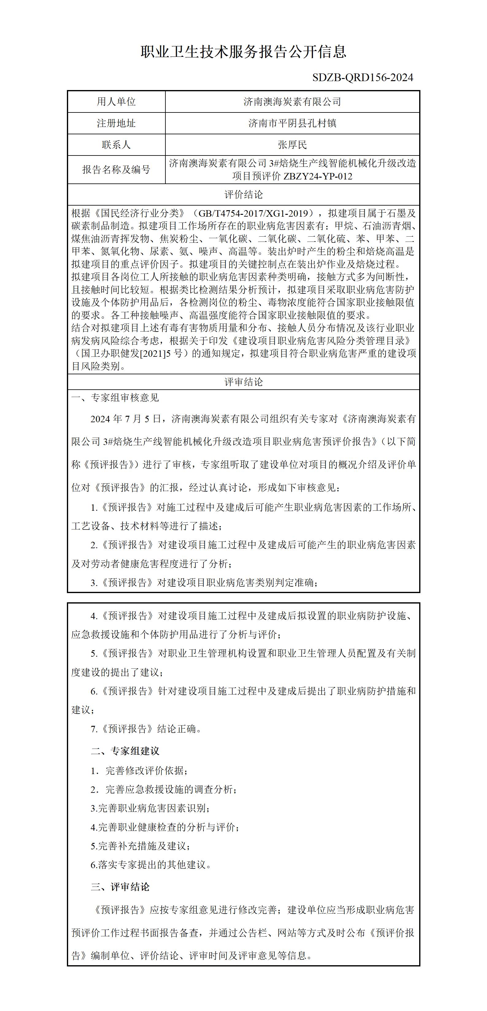 ZBZY24-YP-012济南澳海炭素有限公司3#焙烧生产线智能机械化升级改造项目职业卫生技术服务报告公开信息