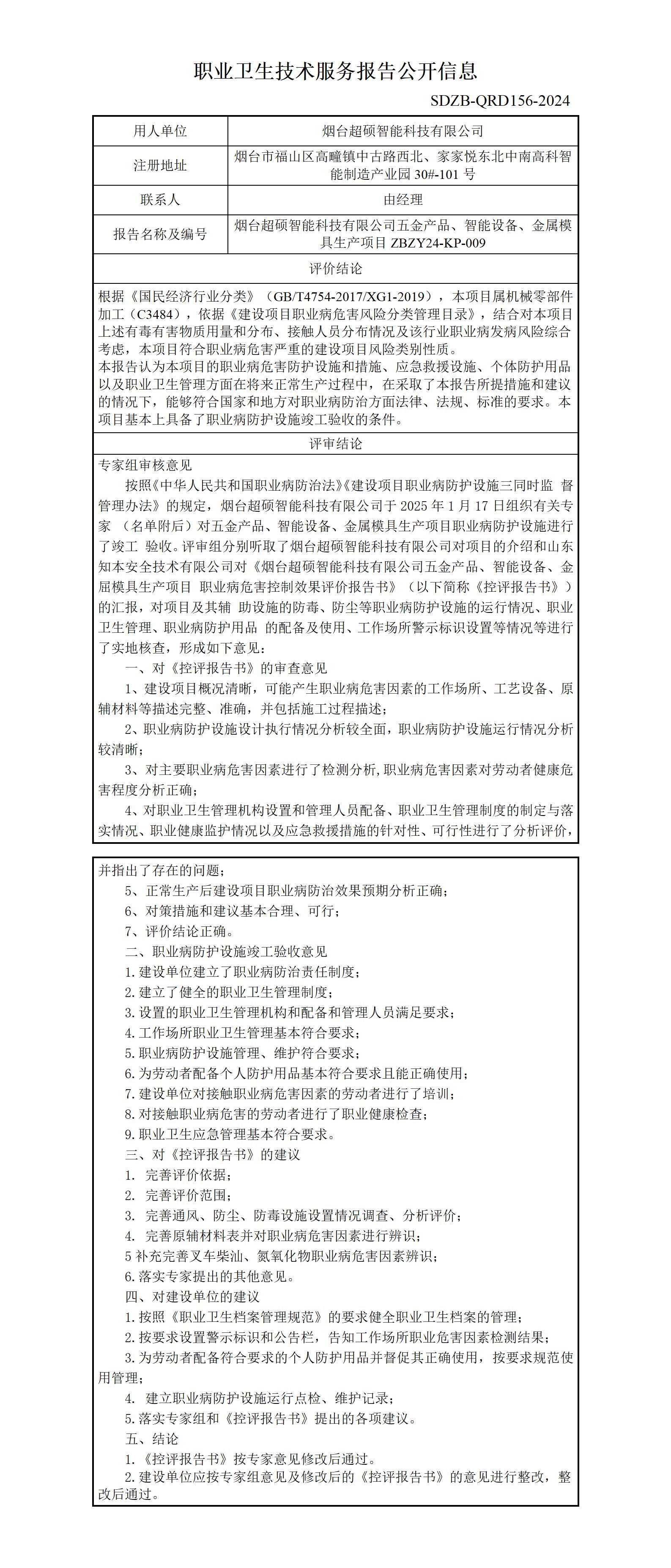 ZBZY24-KP-009烟台超硕智能科技有限公司五金产品、智能设备、金属模具生产项目职业卫生技术服务报告公开信息
