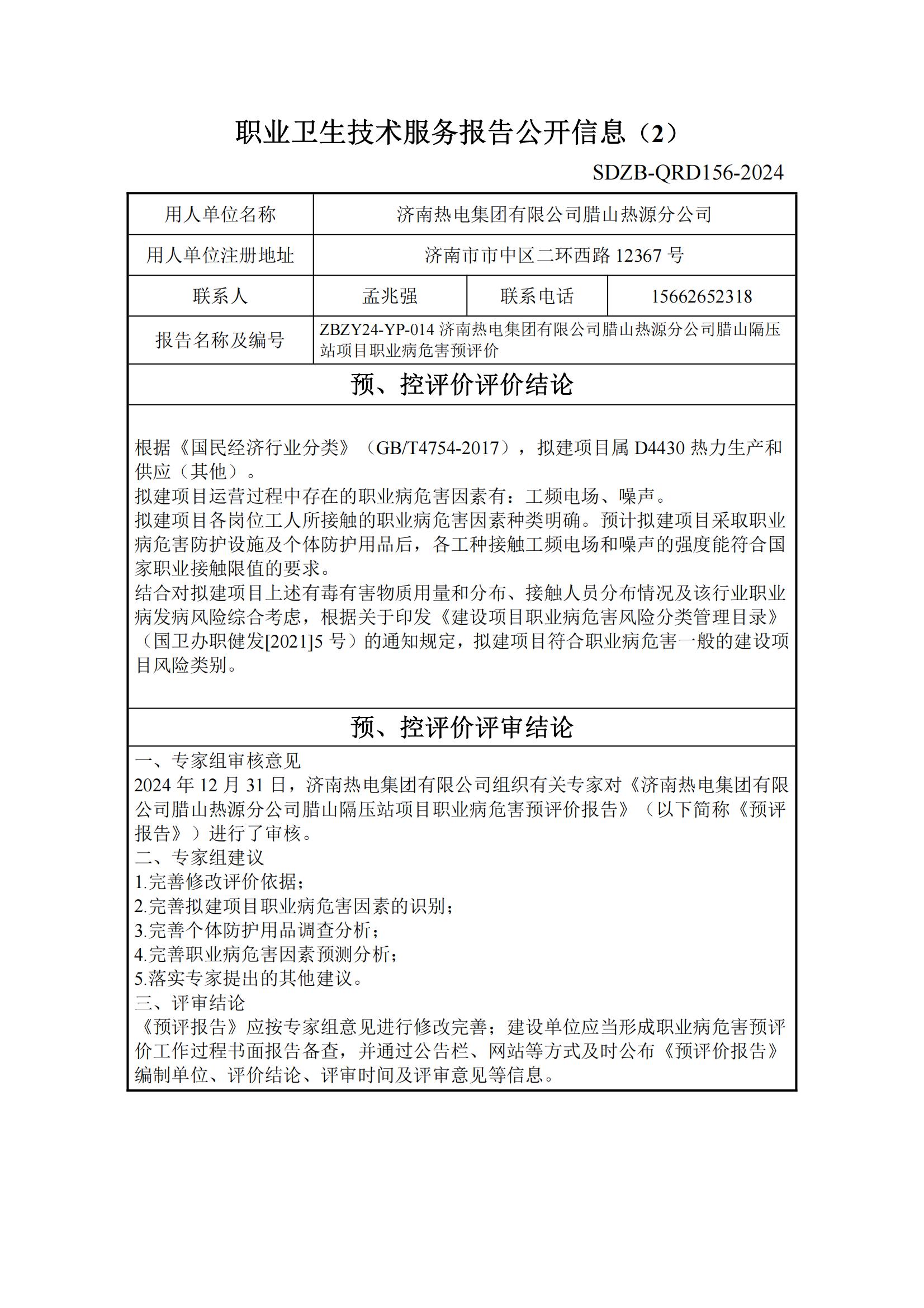 ZBZY24-YP-014济南热电集团有限公司腊山热源分公司腊山隔压站项目职业病危害预评价职业卫生技术服务报告公开信息