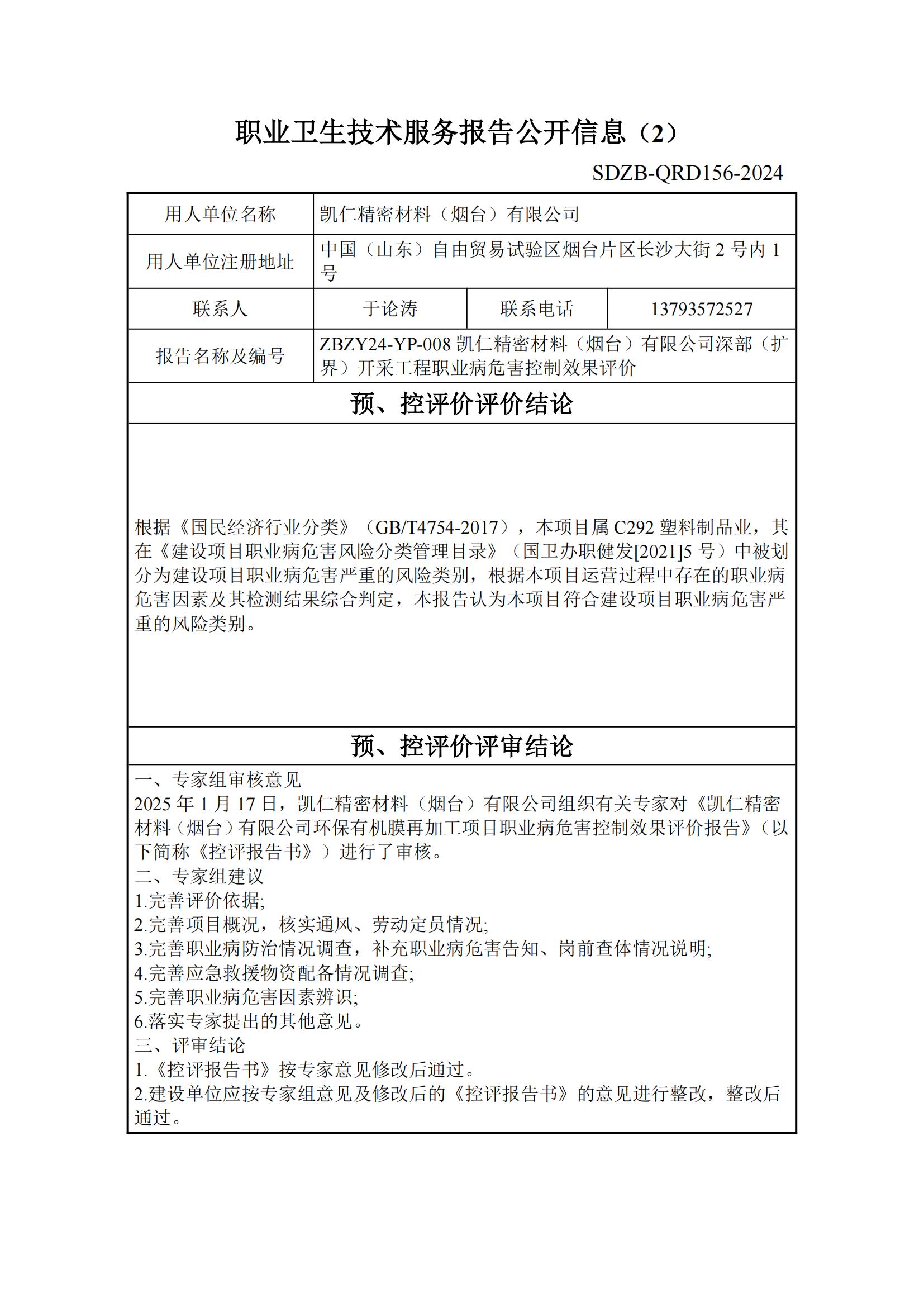 ZBZY24-KP-008凯仁精密材料(烟台)有限公司环保有机膜再加工项目职业病危害控制效果评价--职业卫生技术服务报告公开信息
