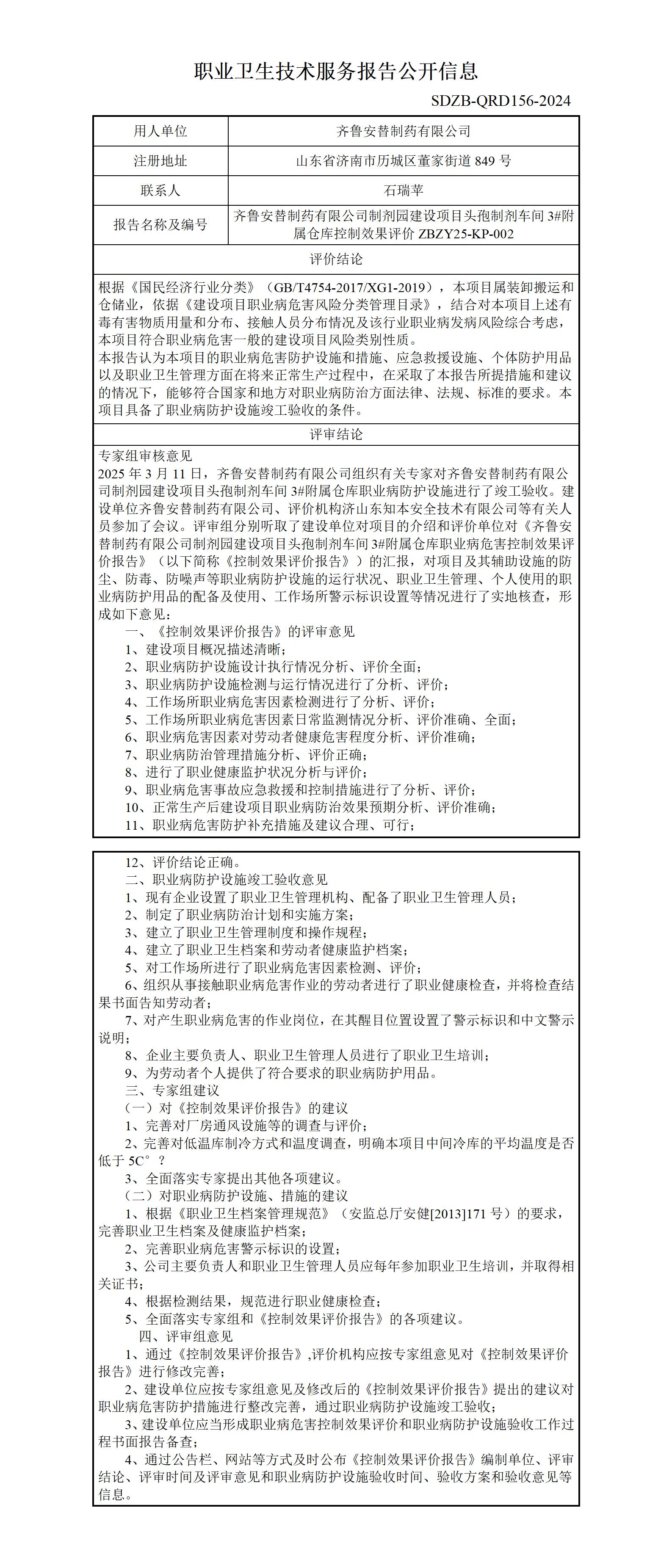 ZBZY25-KP-002齐鲁安替制药有限公司制剂园建设项目头孢制剂车间3#附属仓库职业卫生技术服务报告公开信息