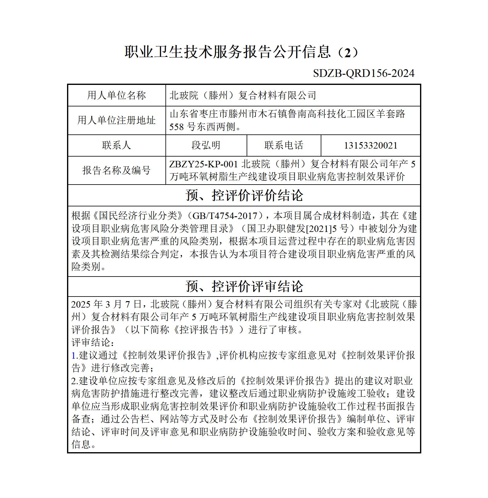 ZBZY25-KP-001北玻院(滕州)复合材料有限公司年产5万吨环氧树脂生产线建设项目职业病危害控制效果评价