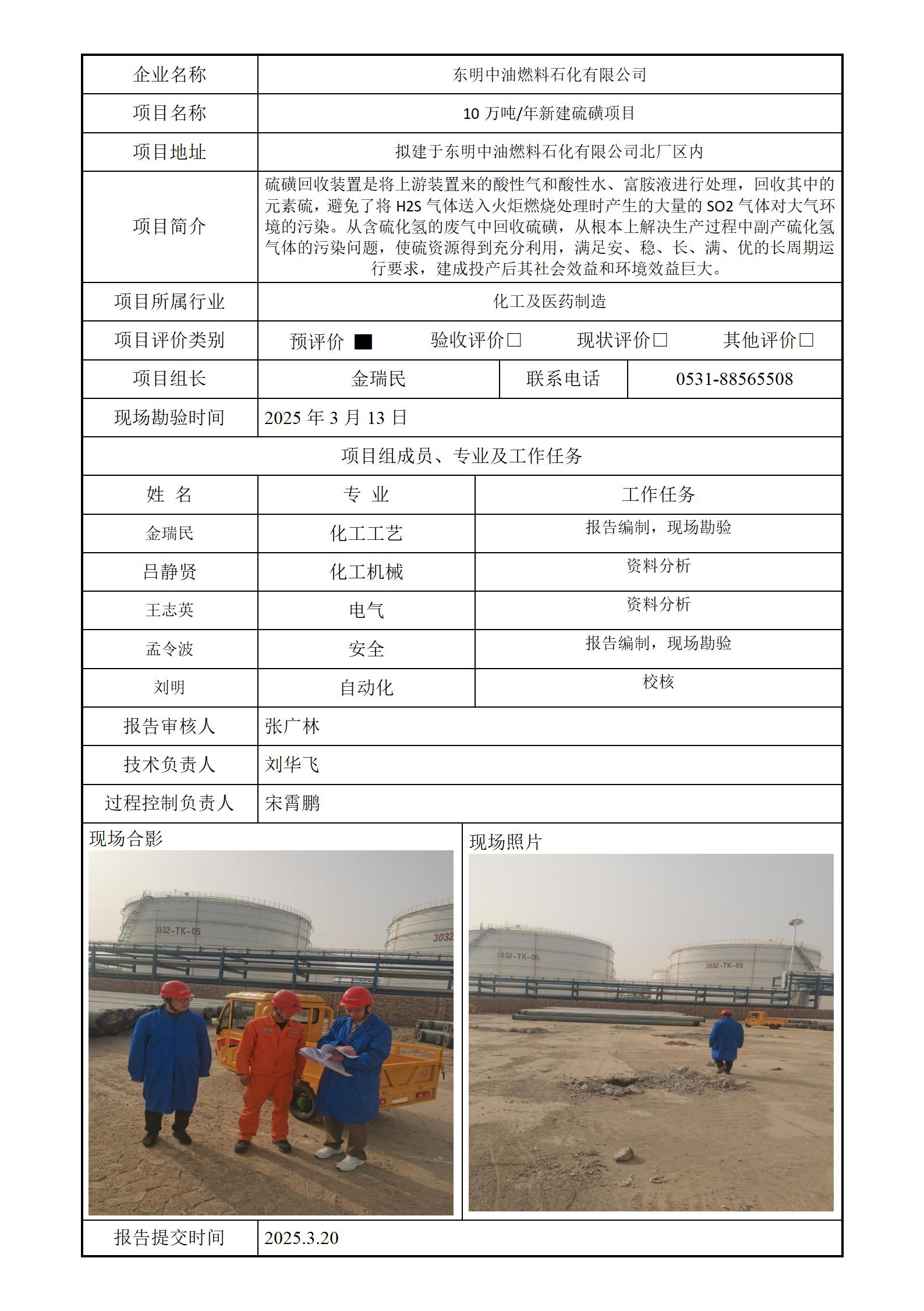 安全评价报告网上公示(东明中油燃料石化有限公司10万吨年新建硫磺项目)设立安全评价)