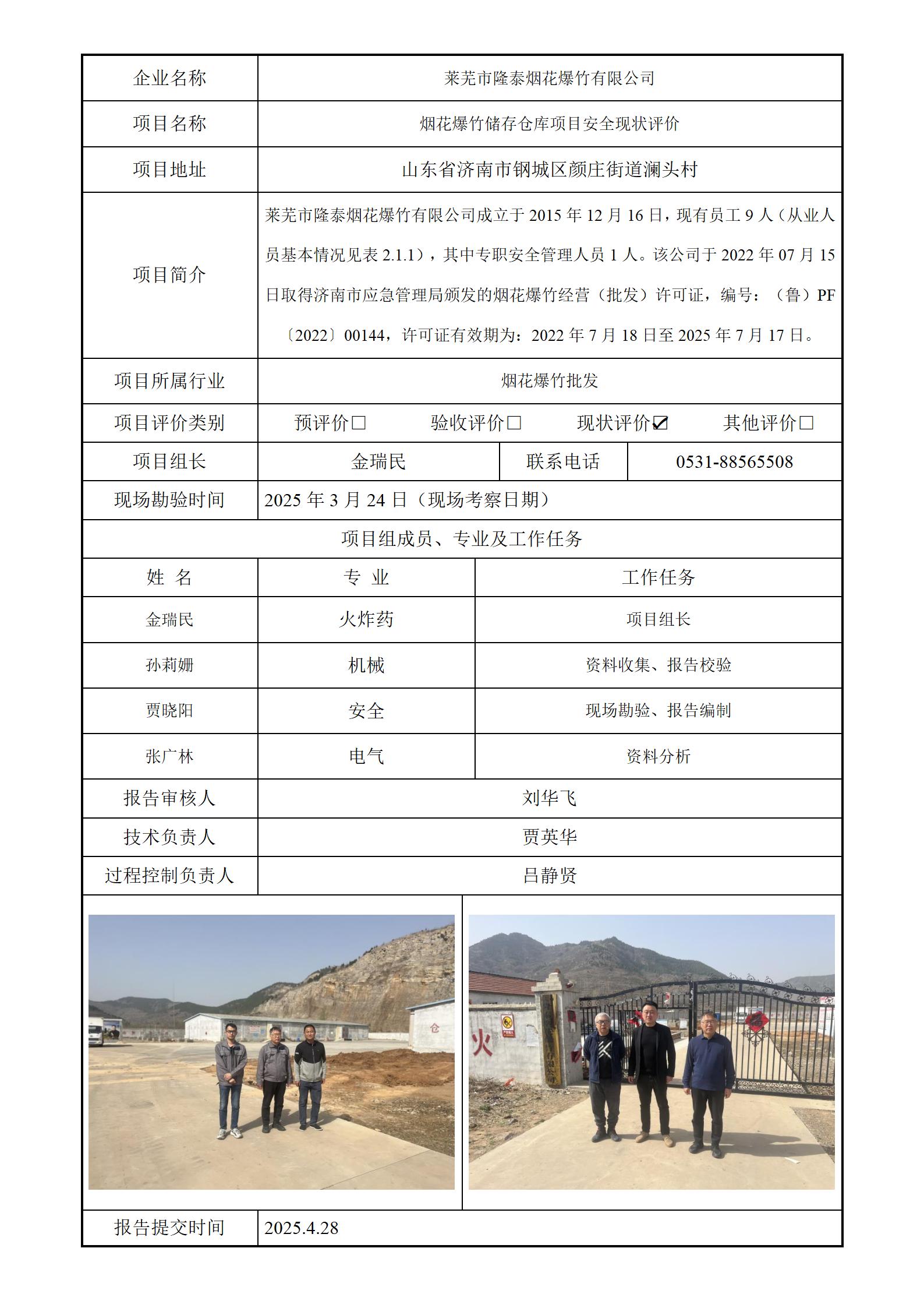 莱芜市隆泰烟花爆竹有限公司安全评价报告信息公开