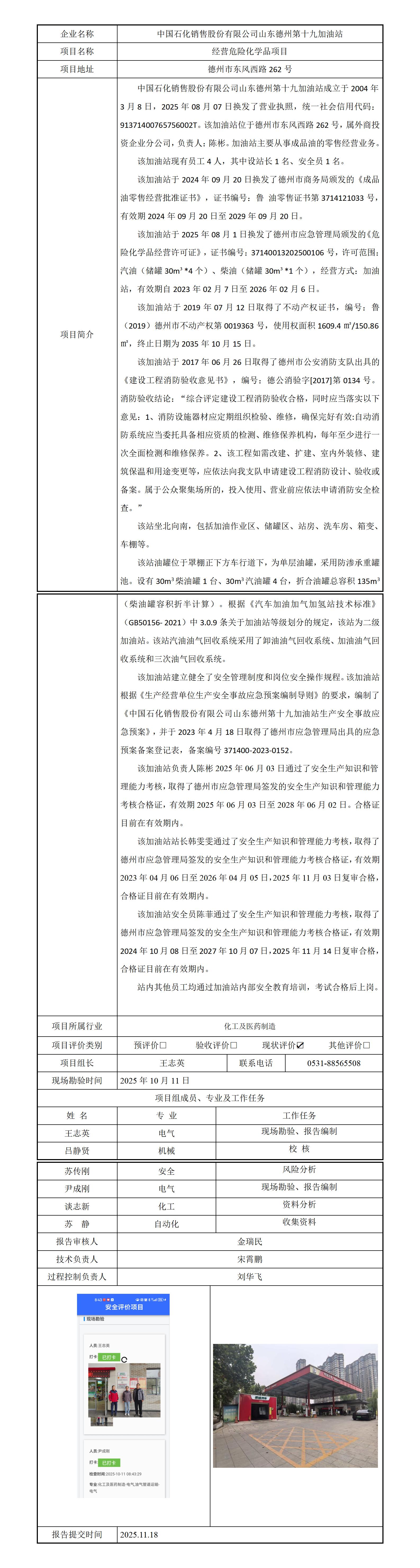 中国石化销售股份有限公司山东德州第十九加油站安全评价报告信息公开