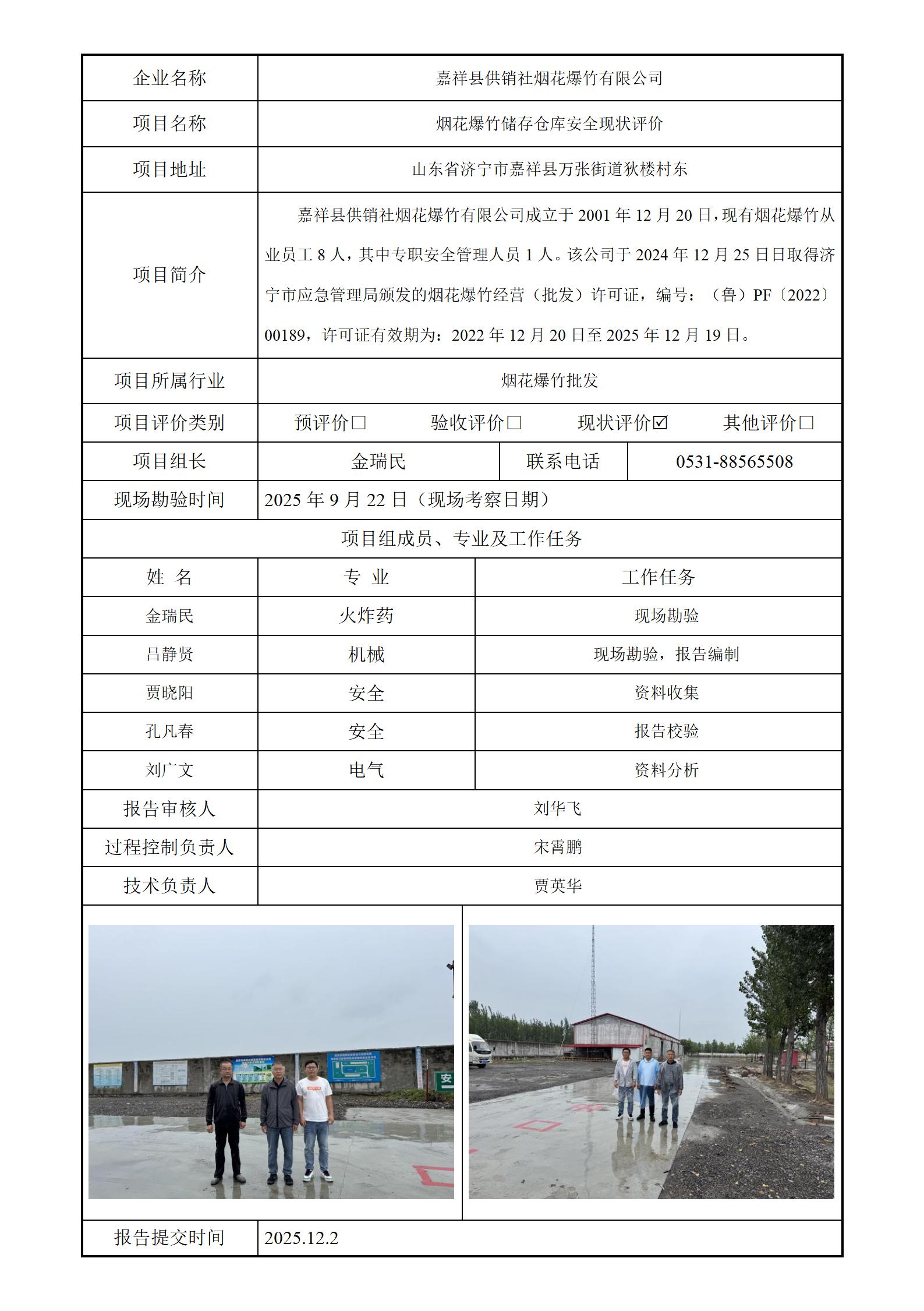嘉祥县供销社烟花爆竹有限公司安全评价报告信息公开