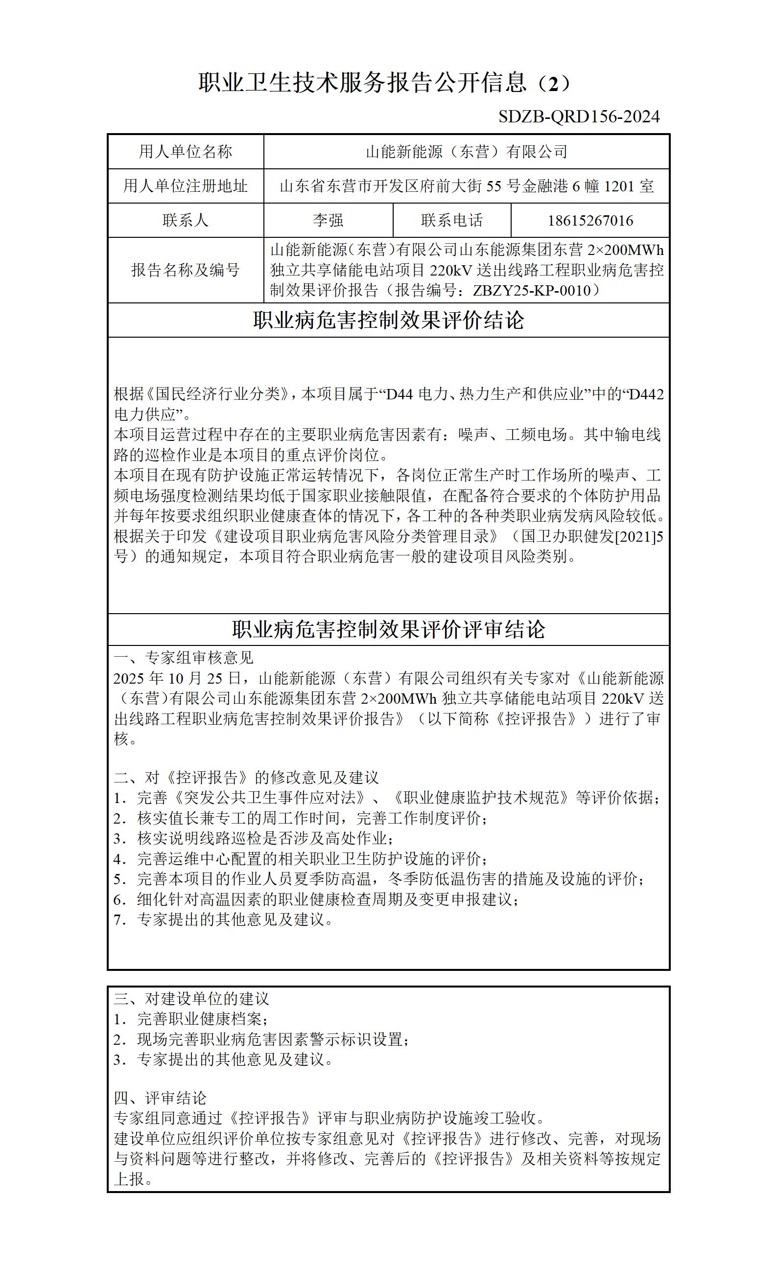 ZBZY25-KP-010山能新能源(东营)有限公司山东能源集团东营2×200MWh独立共享储能电站项目220kV送出线路工程职业病危害控制效果评价职业卫生技术服务报告公开信息