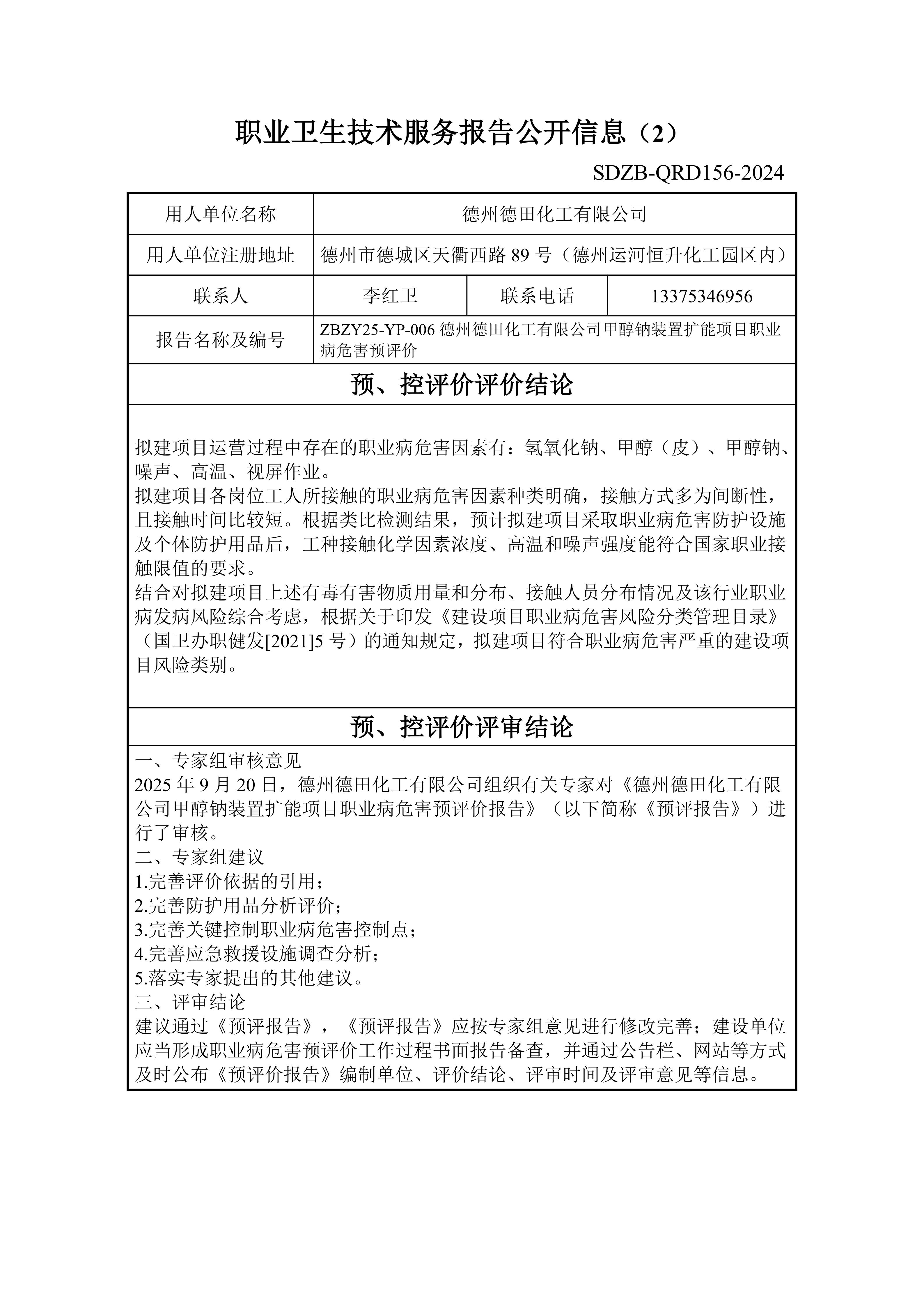 ZBZY25-YP-006德州德田化工有限公司甲醇钠装置扩能项目职业病危害预评价--职业卫生技术服务报告公开信息