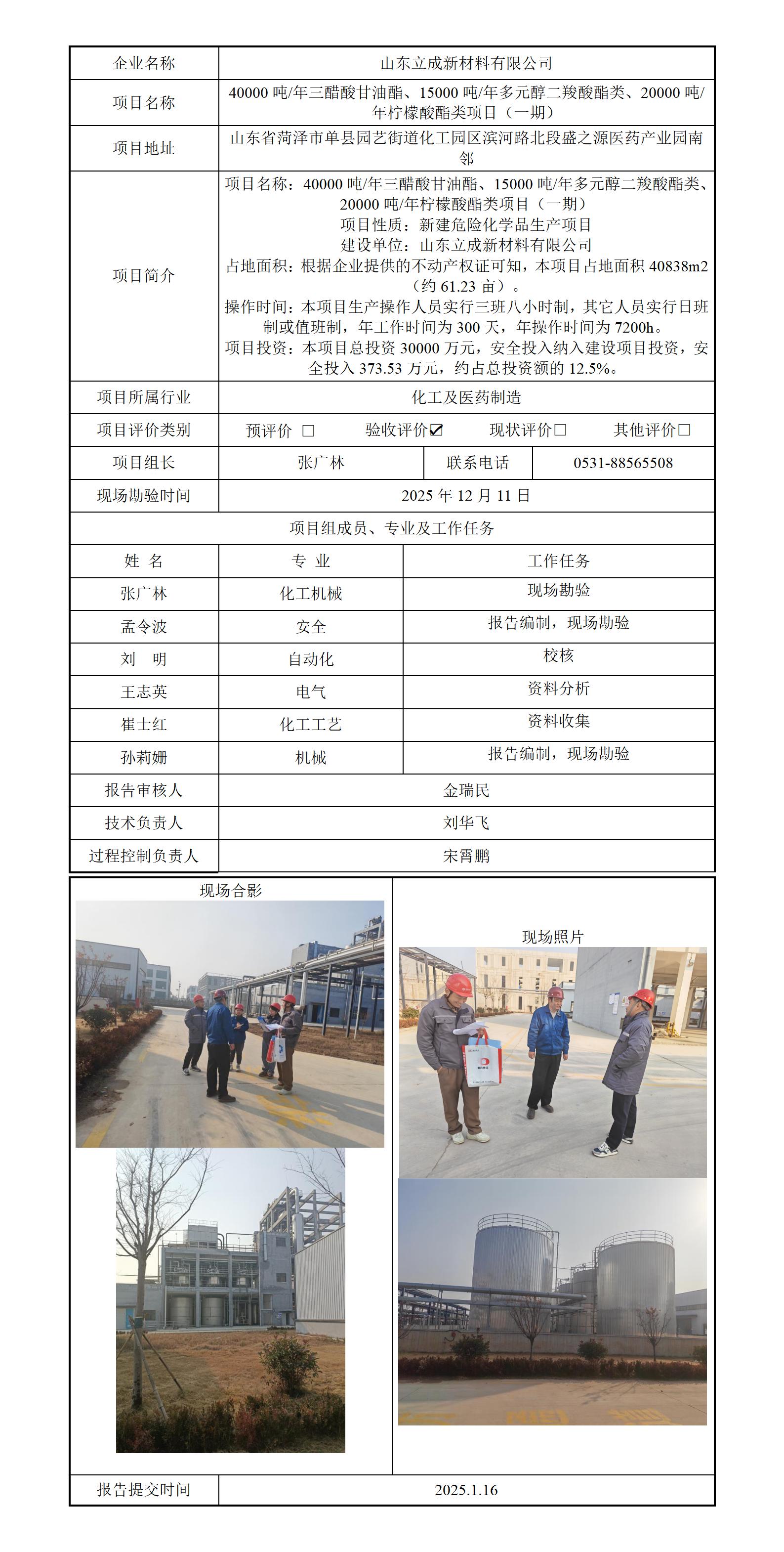 安全评价报告网上公示(山东立成新材料有限公司40000吨年三醋酸甘油酯、15000吨年多元醇二羧酸酯类、20000吨年柠檬酸酯类项目(一期))验收安全评价)