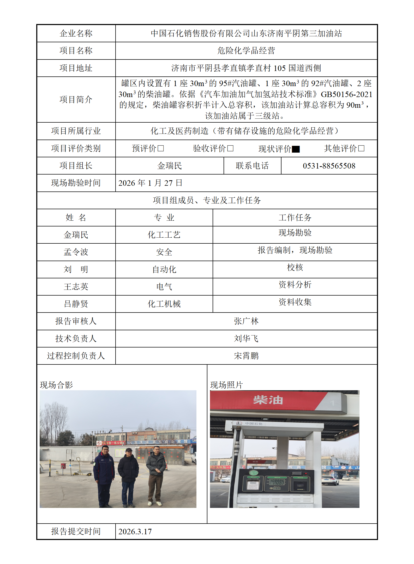 中国石化销售股份有限公司山东济南平阴第三加油站安全评价报告信息公开