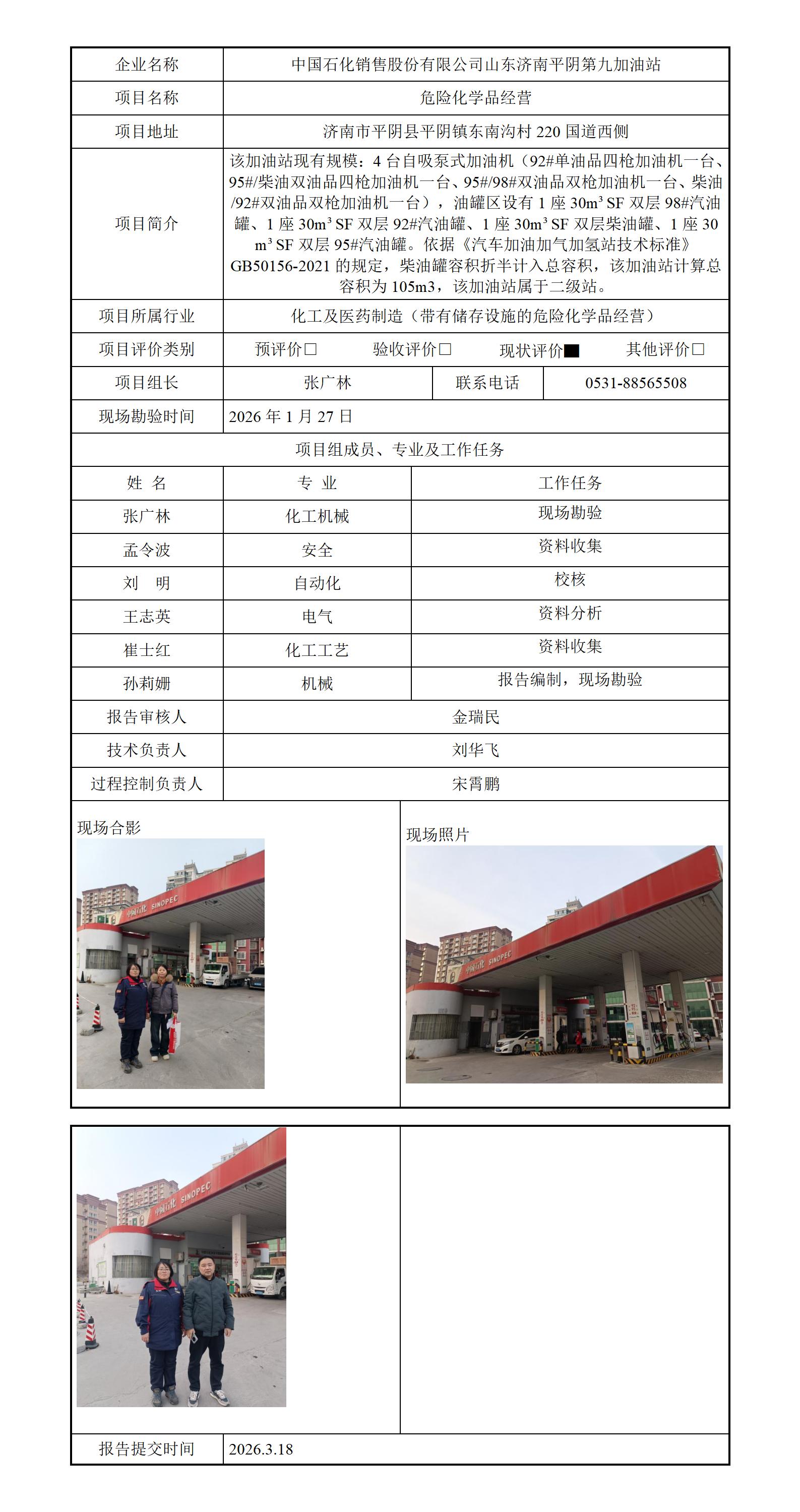 中国石化销售股份有限公司山东济南平阴第九加油站安全评价报告信息公开