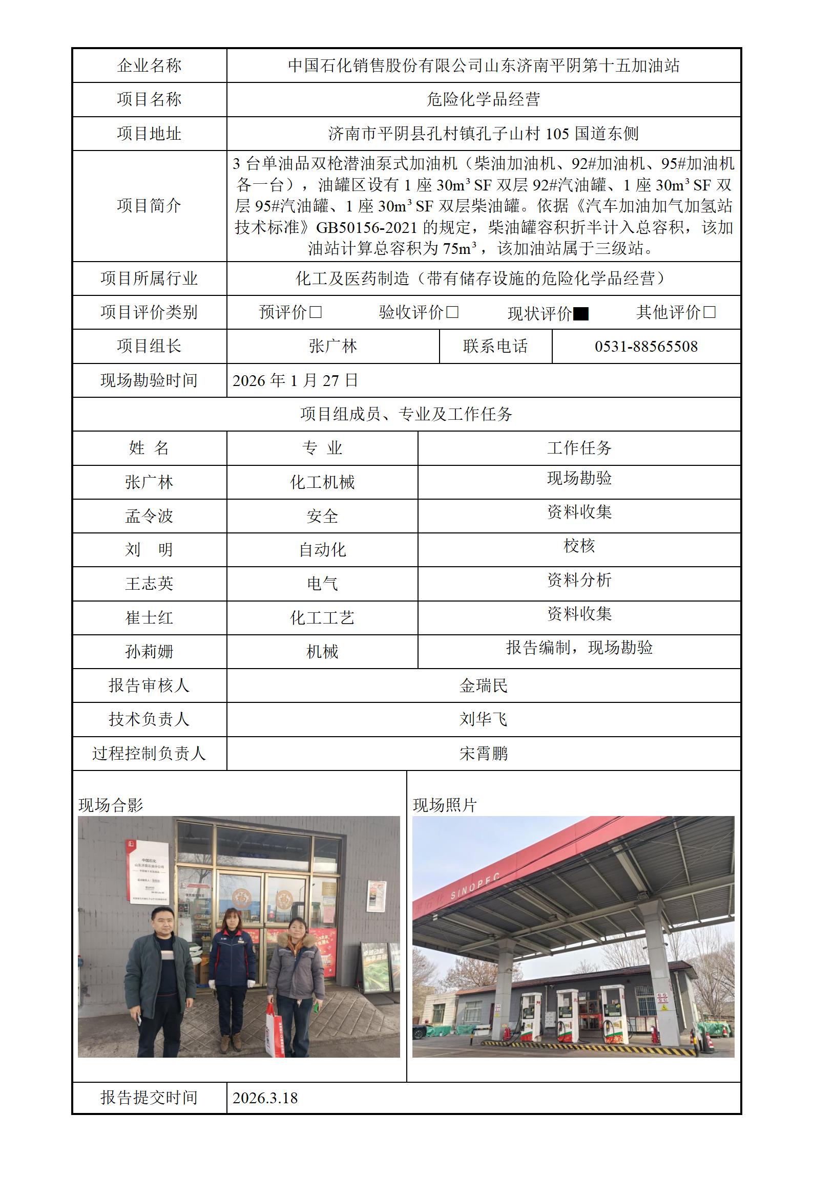 中国石化销售股份有限公司山东济南平阴第十五加油站安全评价报告信息公开