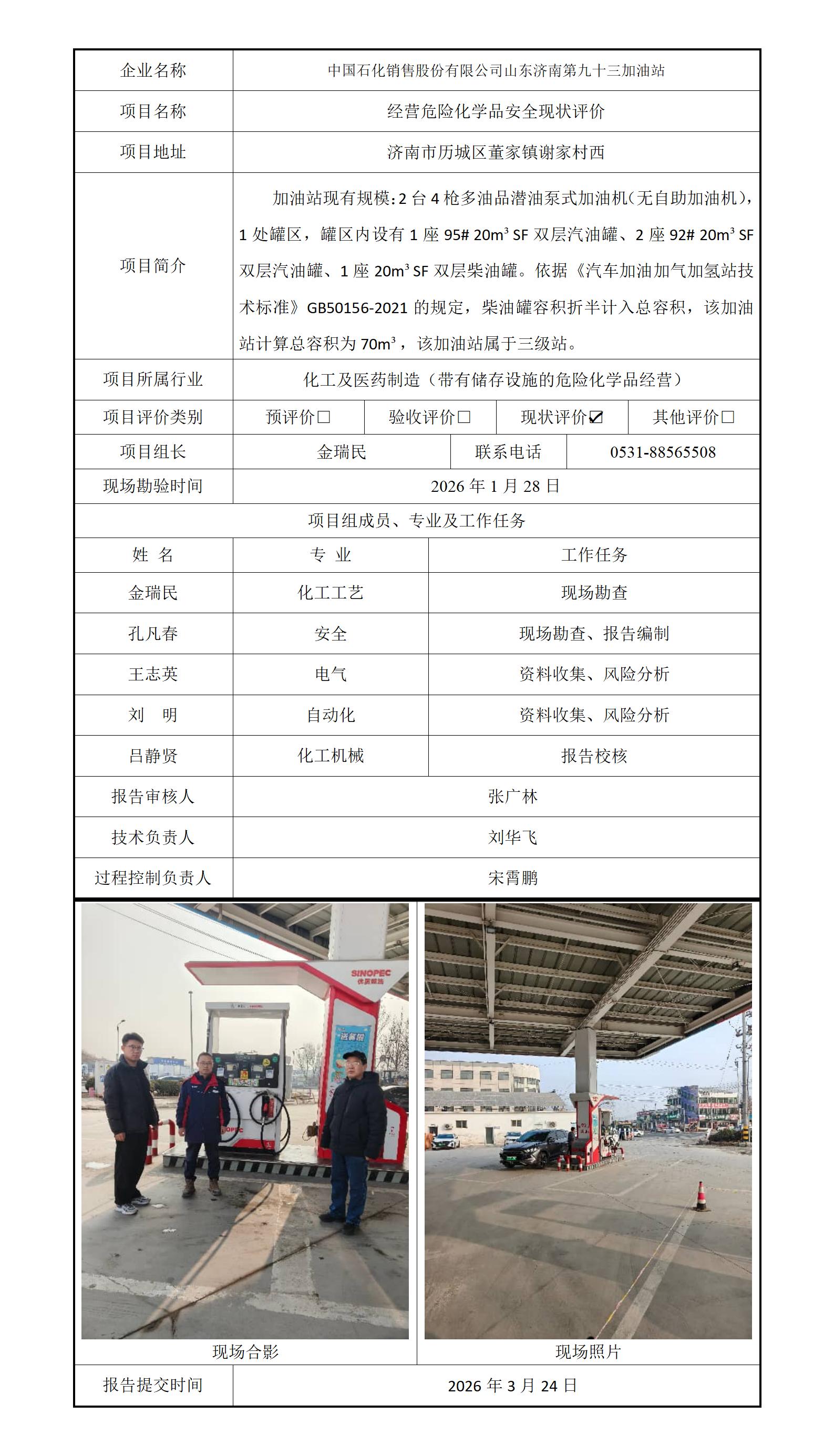 中国石化销售股份有限公司山东济南第九十三加油站安全评价报告信息公开