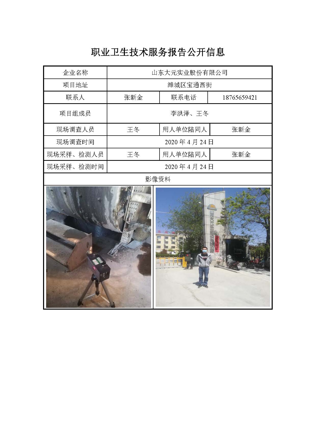 ZBZY20-DQ-122山东大元实业股份有限公司职业病危害因素定期检测