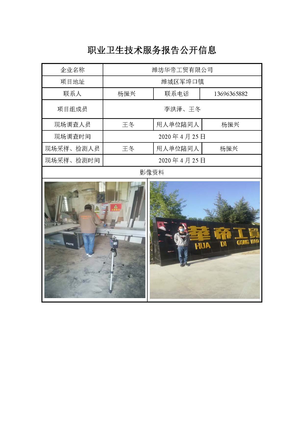 ZBZY20-DQ-123潍坊华帝工贸有限公司职业病危害因素定期检测