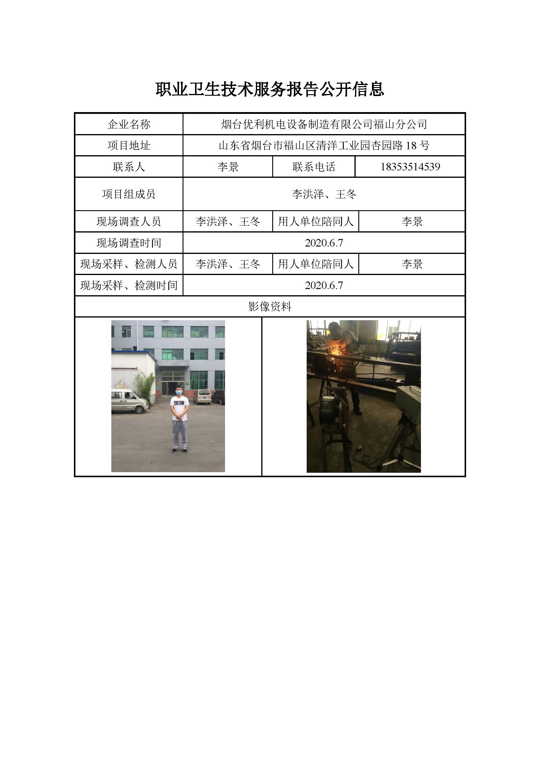 ZBZY20-DQ-137 烟台优利机电设备制造有限公司福山分公司职业病危害因素定期检测