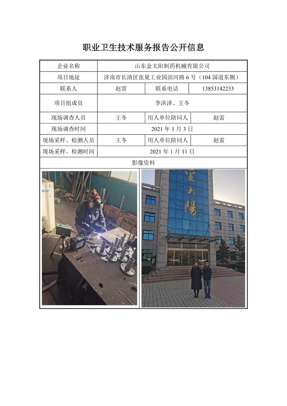 ZBZY21-DQ-001山东金太阳制药机械有限公司职业病危害因素定期检测