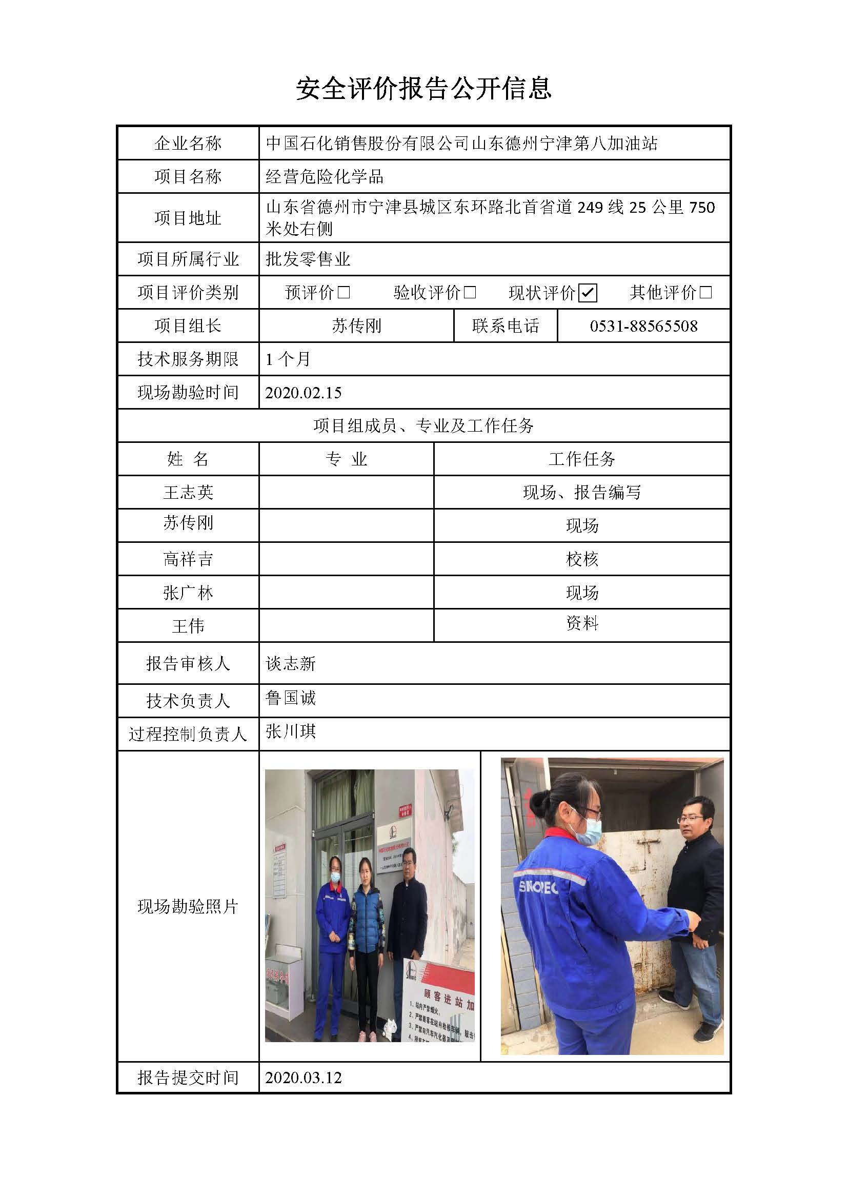 中国石化销售股份有限公司山东德州宁津第八加油站安全评价报告信息公开