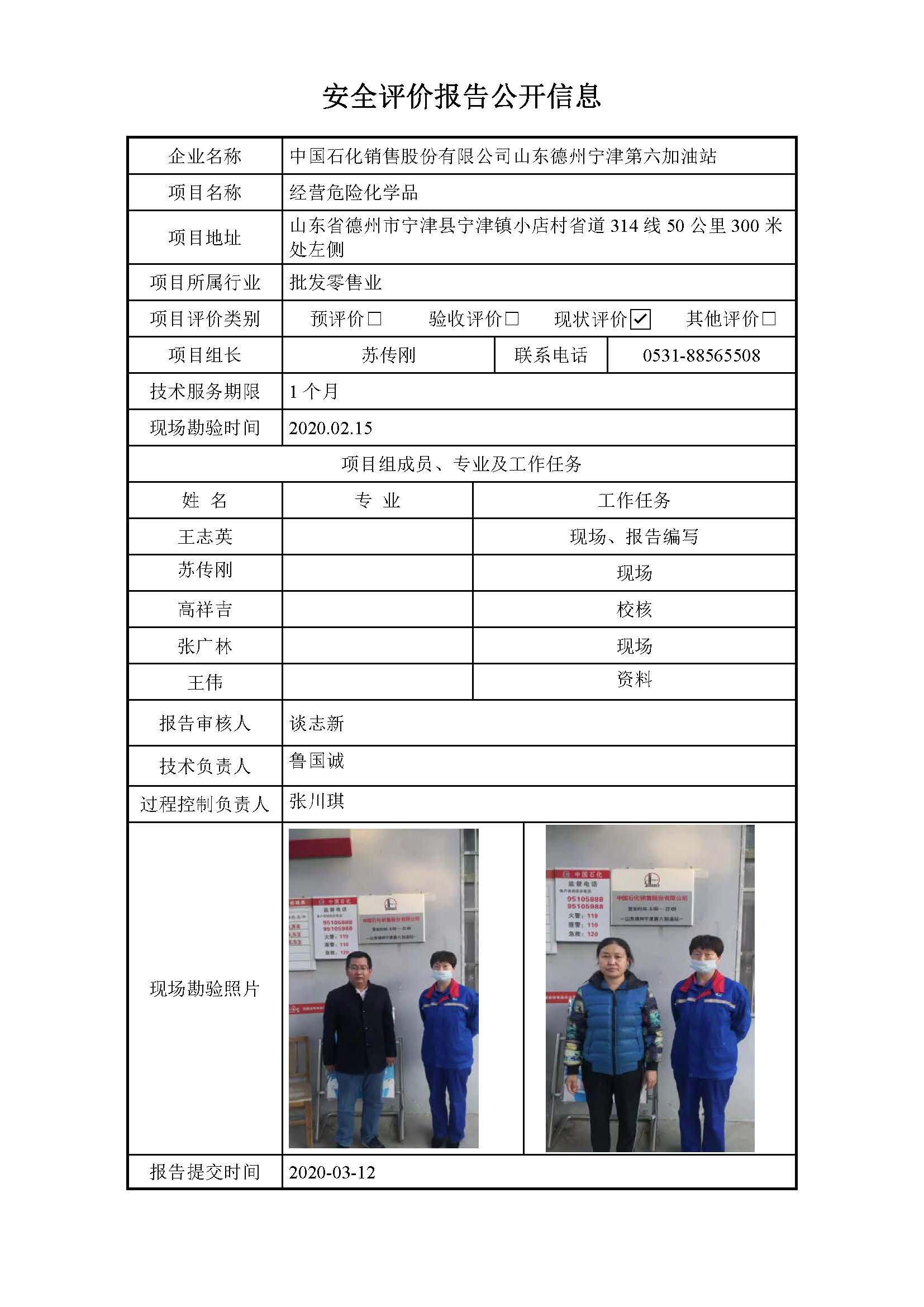 中国石化销售股份有限公司山东德州宁津第六加油站安全评价报告信息公开